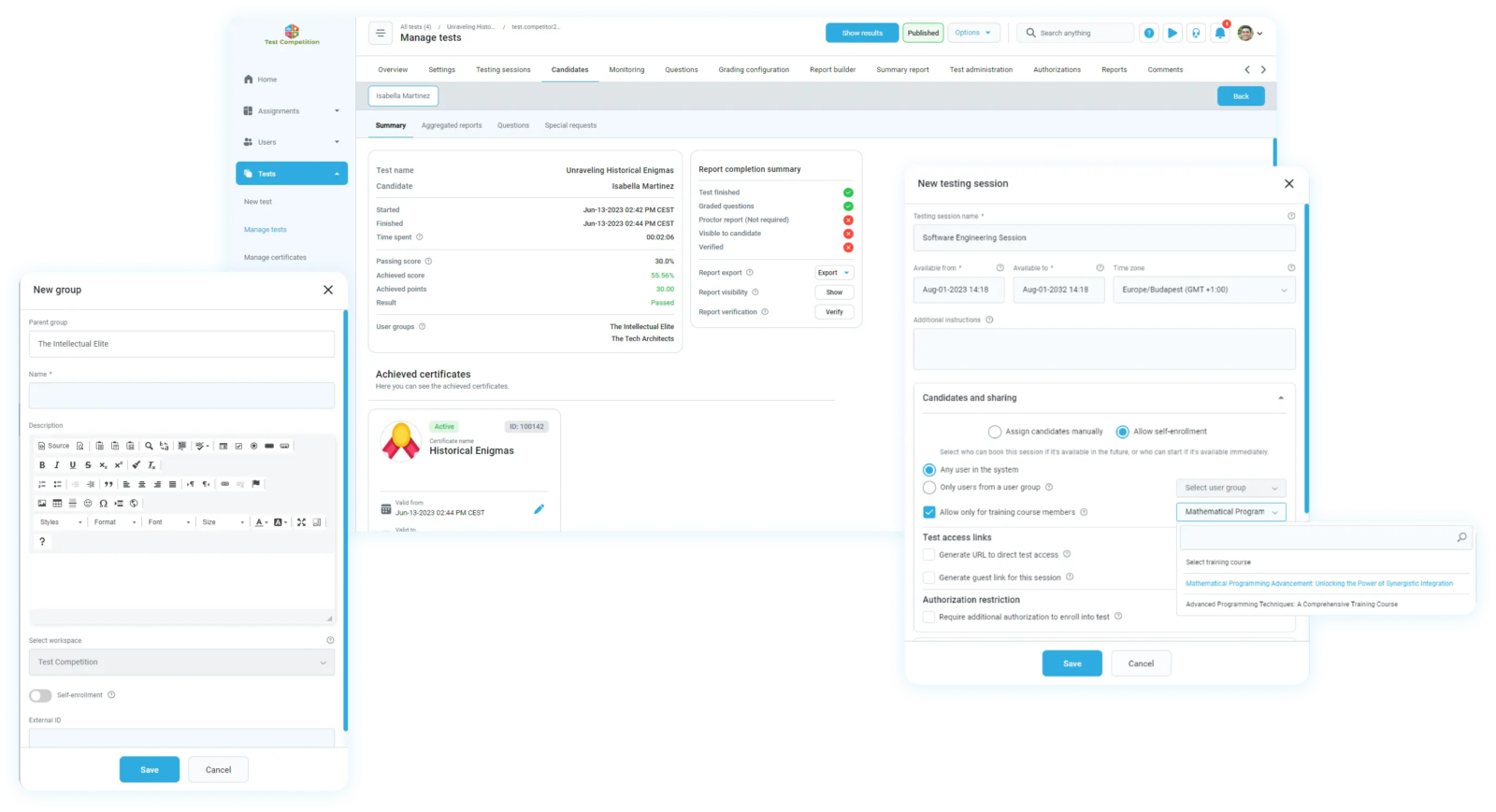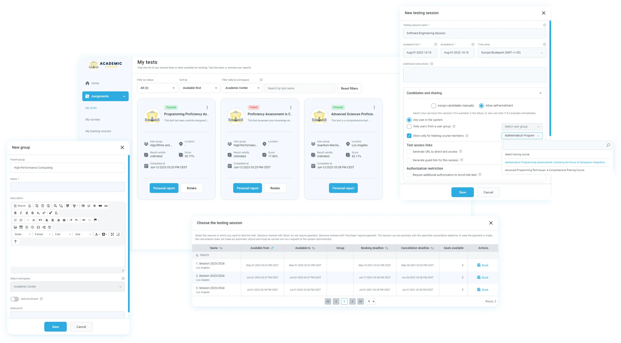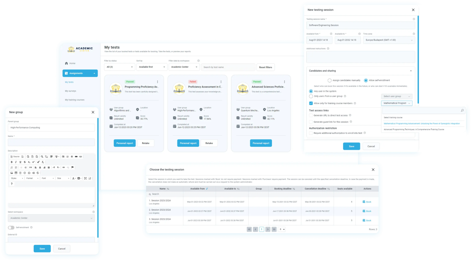 Testing sessions are set time slots for a specific test. If testing sessions correspond with the delivery type of the created test (Online, Pearson VUE, Paper), they will be automatically linked to it. Define the enrollment conditions and limit how many candidates can take the test simultaneously. Everyone enrolled in a testing session can take the test during its availability. Candidates can retake tests if they don't pass, and you can decide how long results and certificates remain valid to encourage recertification.