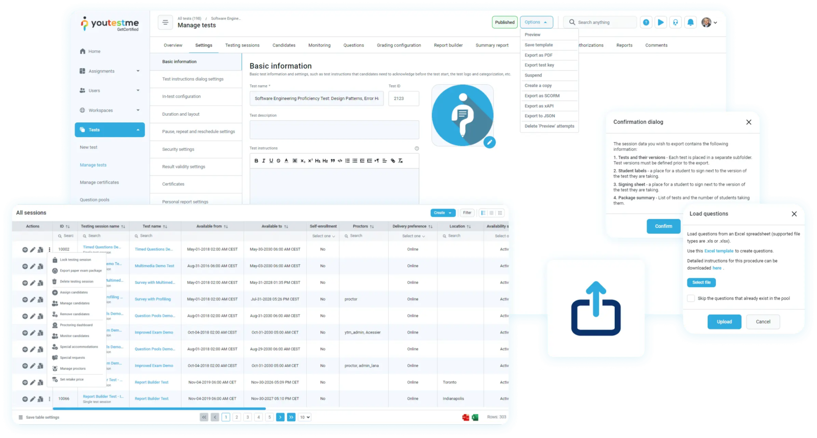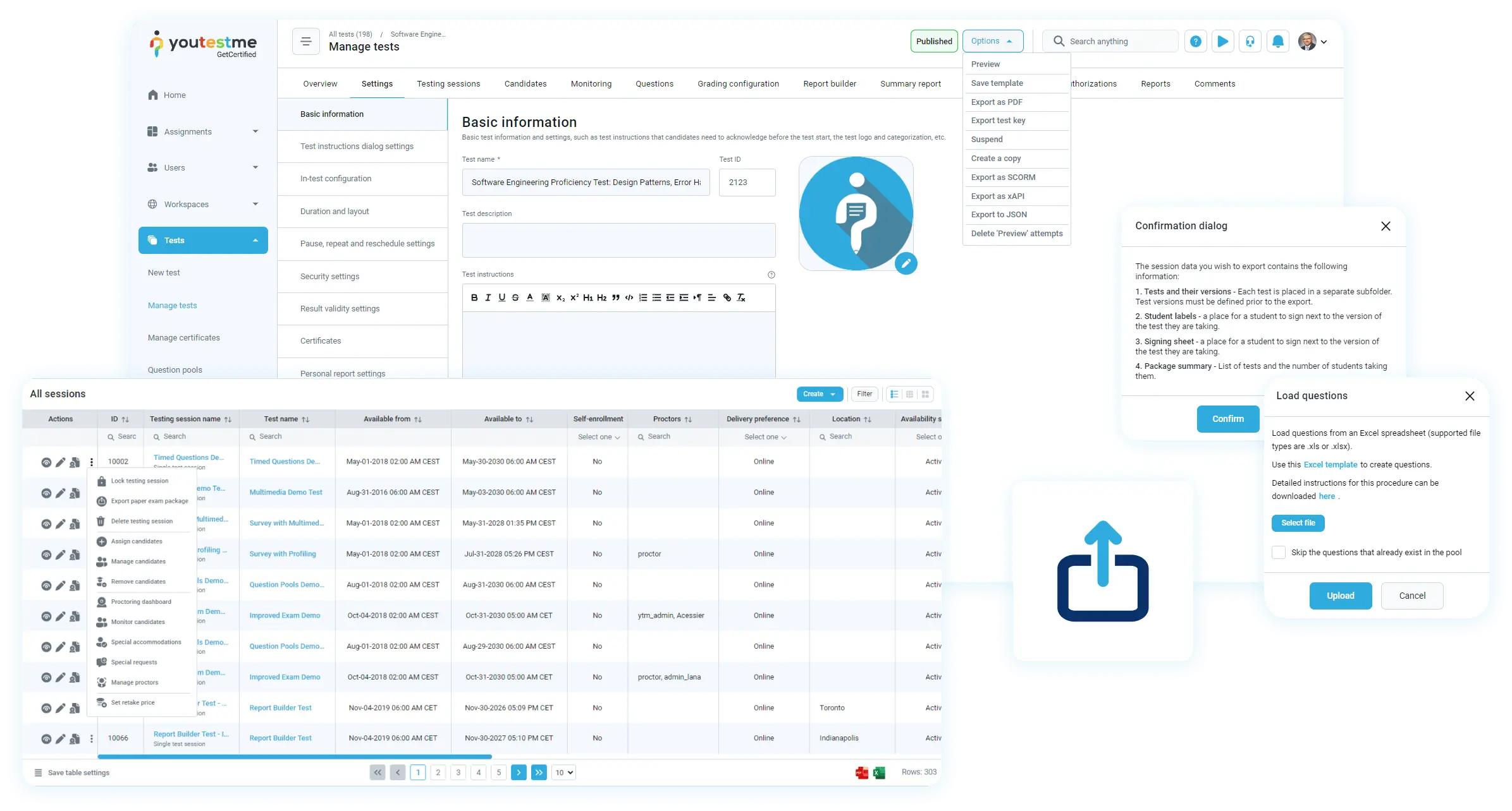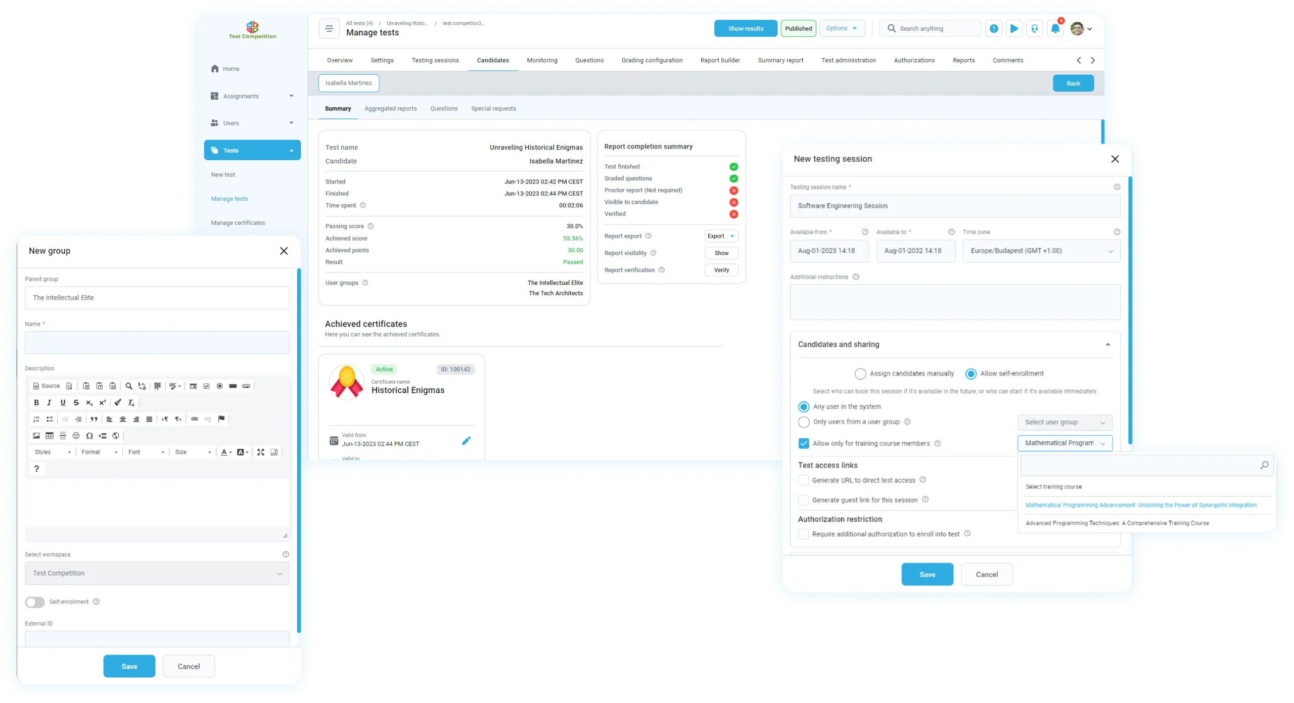Testing sessions are set time slots for a specific test. If testing sessions correspond with the delivery type of the created test (Online, Pearson VUE, Paper), they will be automatically linked to it. Define the enrollment conditions and limit how many candidates can take the test simultaneously. Everyone enrolled in a testing session can take the test during its availability. Candidates can retake tests if they don't pass, and you can decide how long results and certificates remain valid to encourage recertification.
