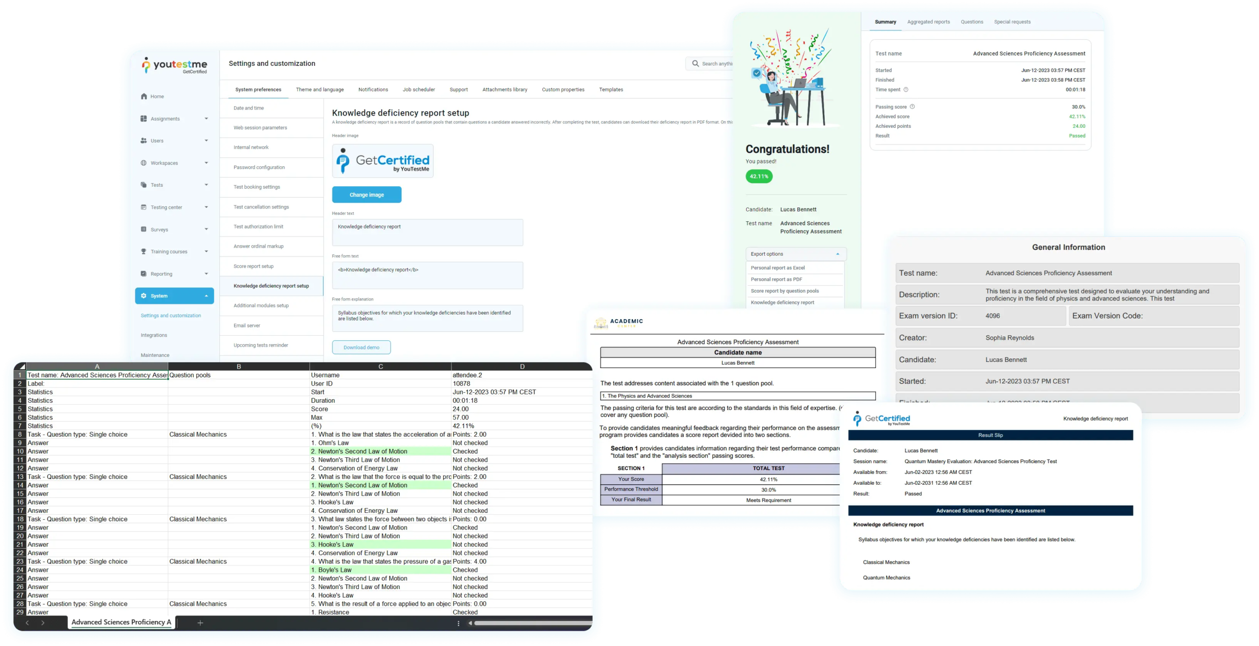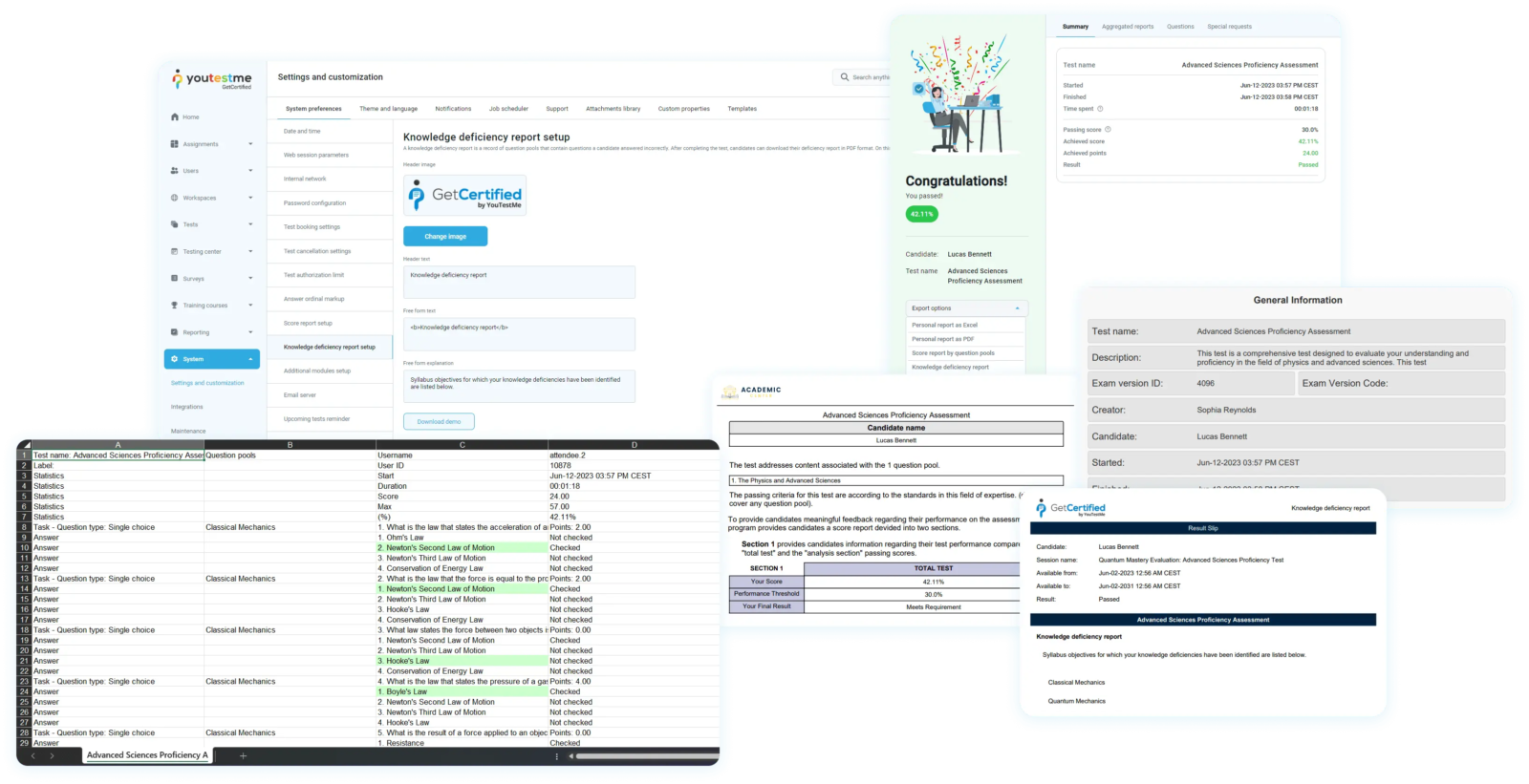 Create a ZIP file of YTM tests and necessary materials for paper-based certification. You can print the answer bubble sheets and then input the answers back into YTM. The system automates grading and provides detailed reports. The report builder lets you handpick specific parameters for comparison to align with your desired comparative analysis. Results can be filtered by achievements or specific areas of knowledge.