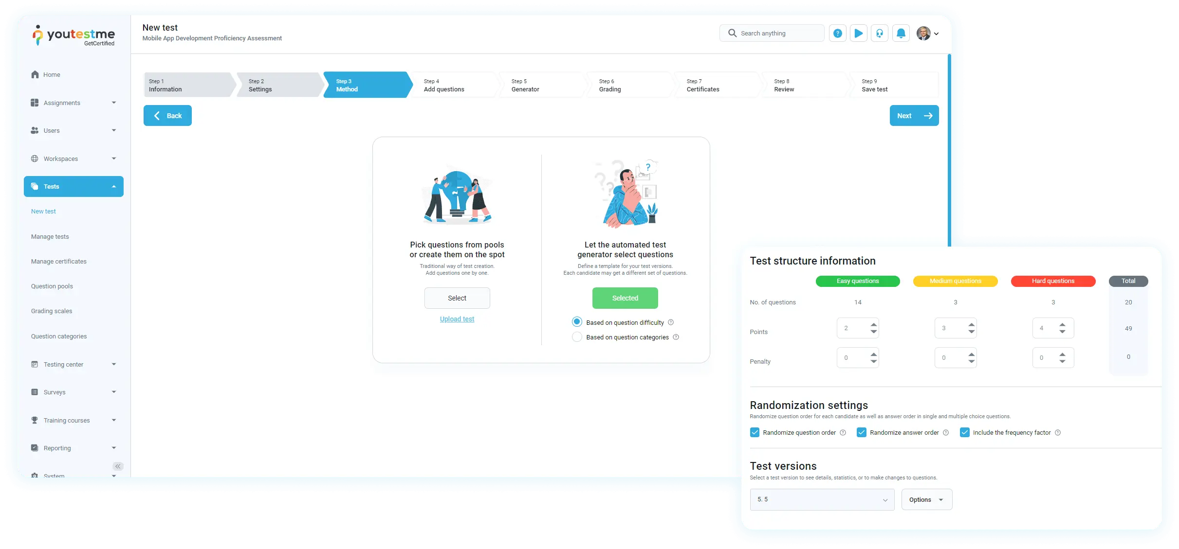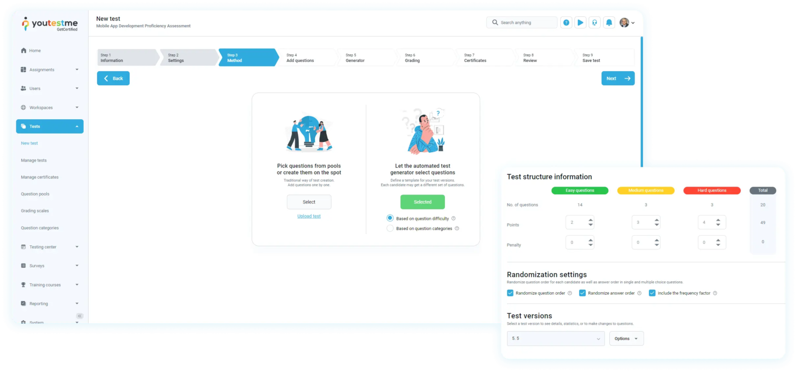 Create tests with multiple sections to separate different subjects. Write the questions manually, import pre-existing ones, or use AI to generate questions. Keep tests secure by creating multiple test versions and randomizing the questions.