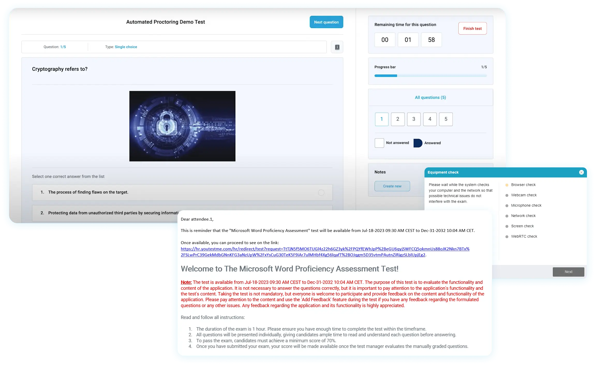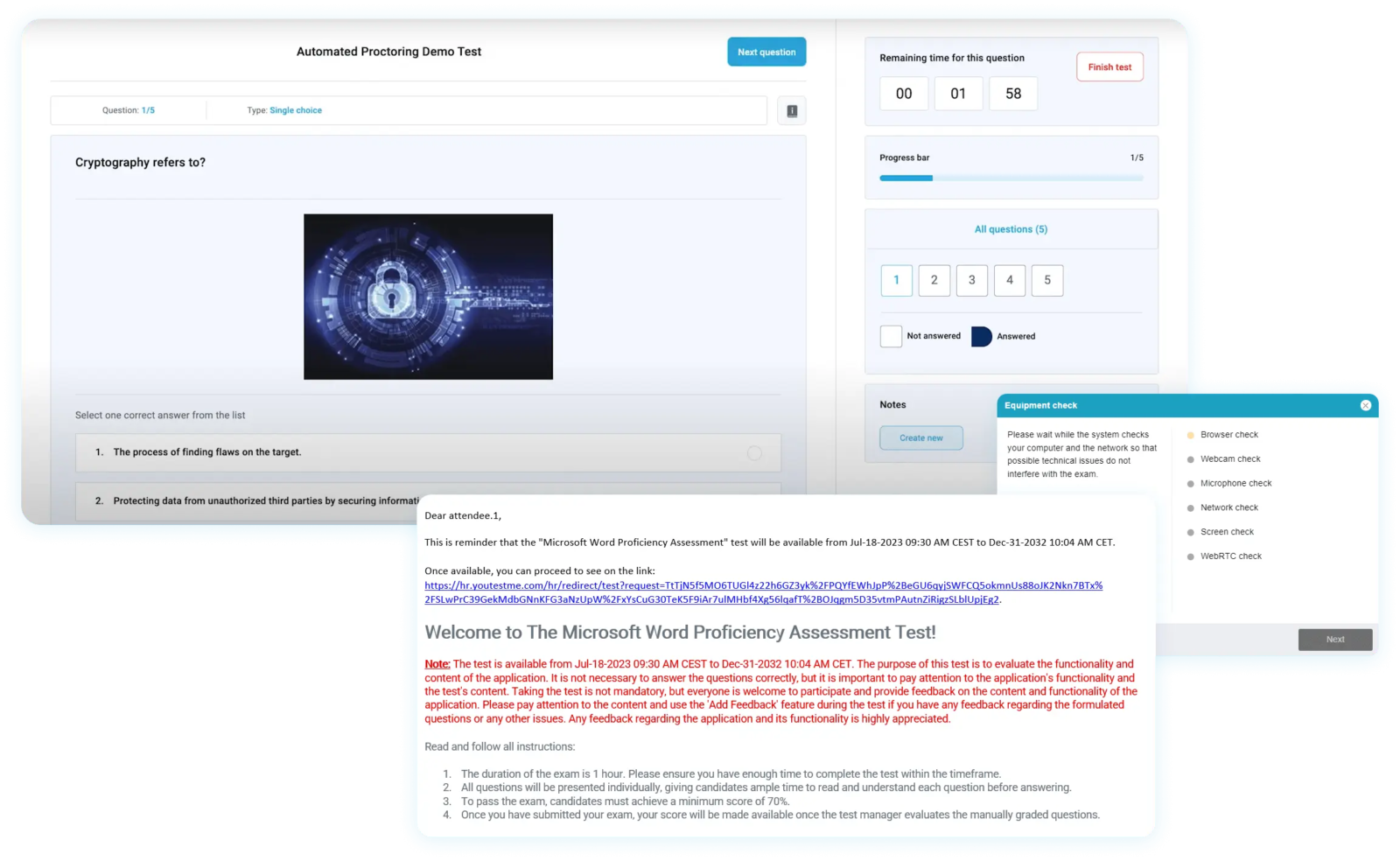 Schedule a discovery call with YouTestMe today to enhance your examination approach outside physical locations with advanced cheating prevention mechanisms for online examinations. We provide tailored solutions that prioritize the integrity of online examinations through cutting-edge prevention tools and proctoring mechanisms. Benefit from expert guidance on the convenience of test creation within the app. Plus, easily export tests for in-person examination and import them back for efficient grading.