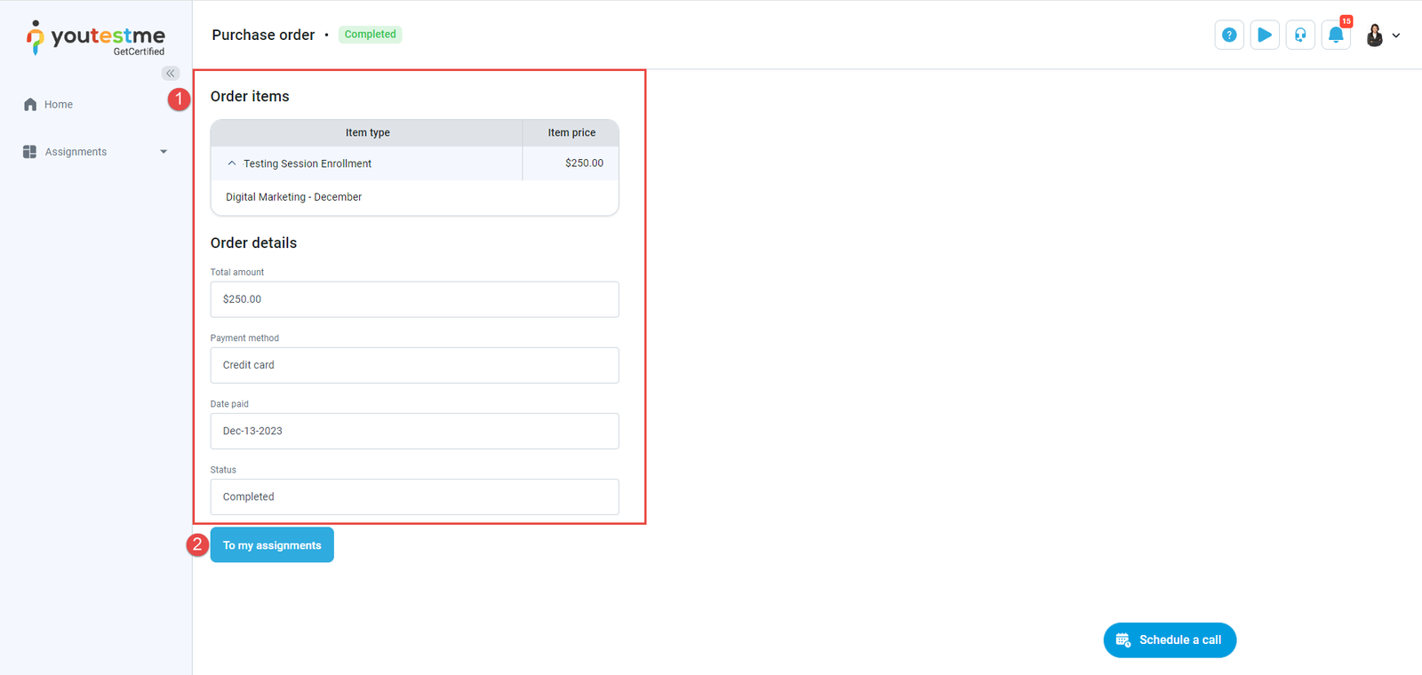 Once you have successfully paid for the exam, you will be redirected to the purchase order page. Here, you can: