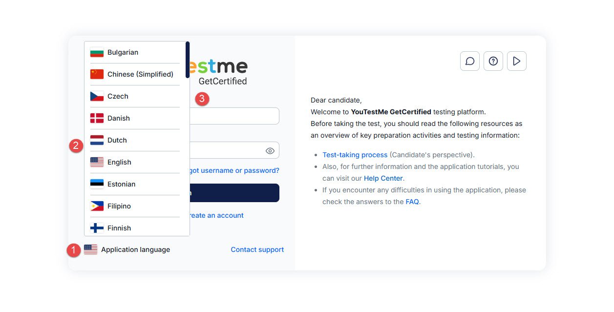 - Under “Language in test,” select the language you want to use for test questions (if available).