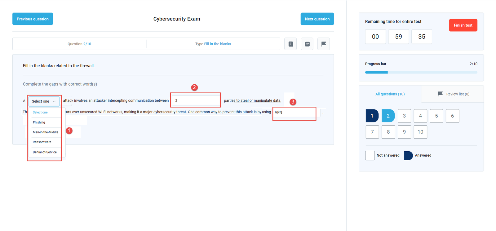 Fill-in-the-blanks questions require candidates to complete a sentence or statement by adding the missing phrase or value. There are three ways to fill in the blank: