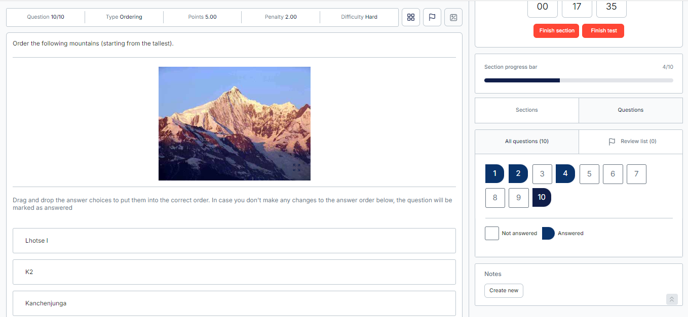 Ordering questions present a list of items in an incorrect sequence. Candidates must arrange them in the correct order by dragging and dropping. These are useful for chronological or process-based assessments.
