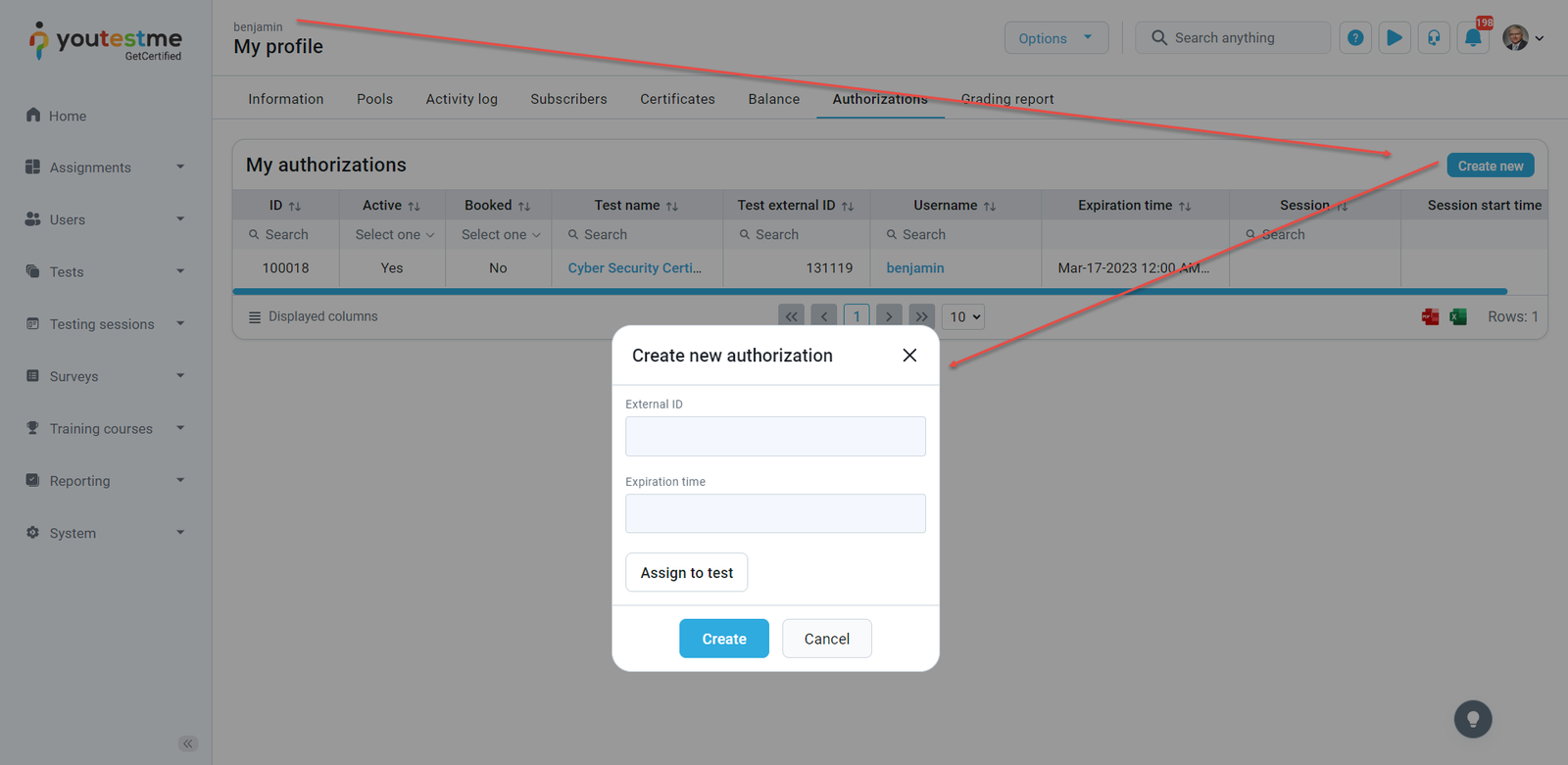 A testing session serves as an organizational unit and includes important details, such as availability, deadlines, authorization, and payment.