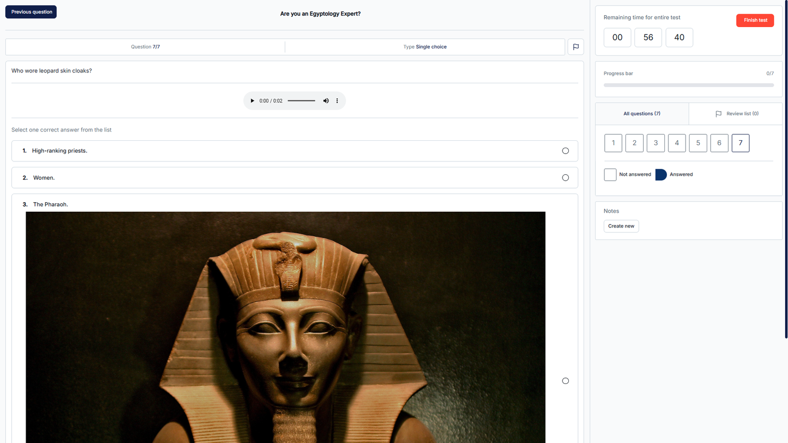 Besides the multimedia embedded in the question text, you can also attach files in different formats that relate to the question, such as literature relevant to both the question and its potential answers. You have the option to create a new attachment or choose from the existing library. Test attachments will be displayed separately from those specifically linked to the questions.