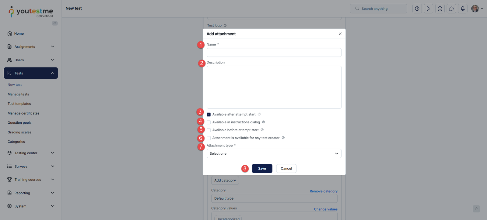 To add an attachment to a published test, navigate to the settings of the desired test and select the Attachment tab, where you can manage the test attachments and upload new ones or import them from the library.