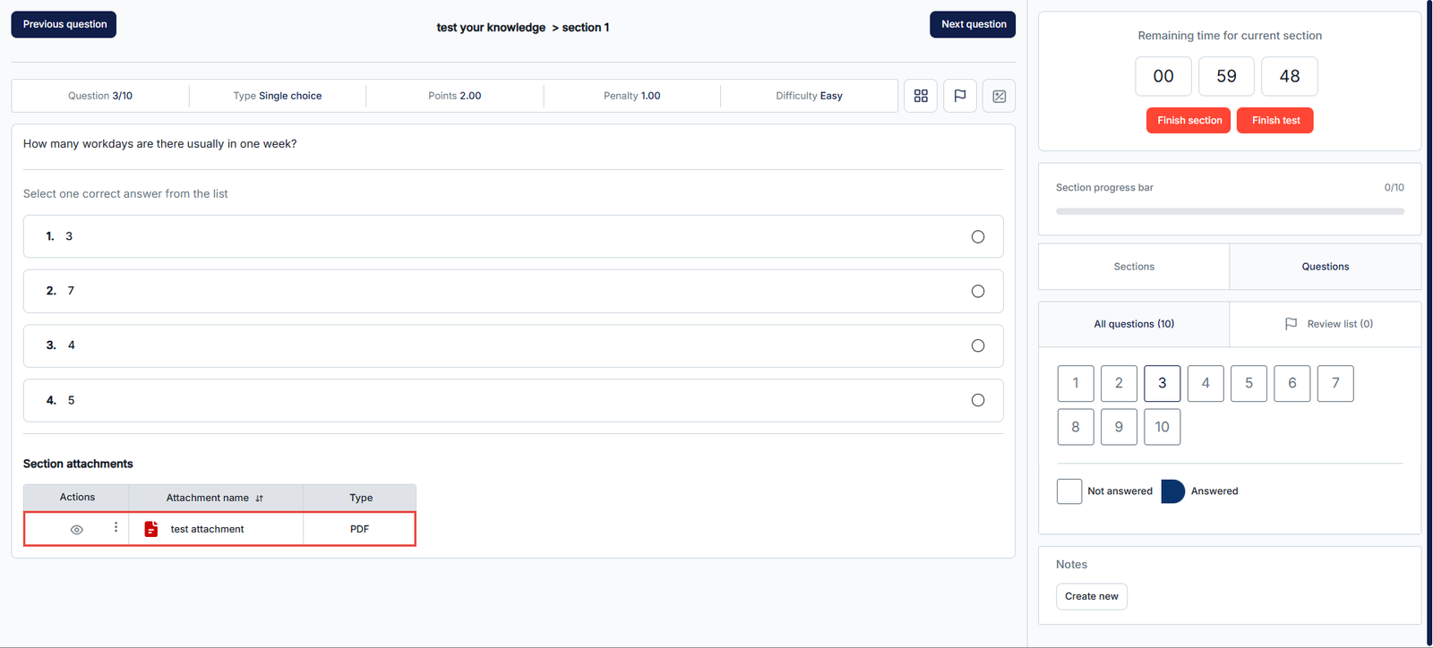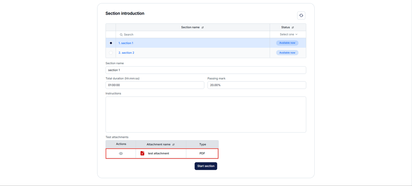 - Section Attachments: In a test with sections, adding different attachments to each section is possible. These attachments can be accessed by students from the section instructions or throughout the entire section.