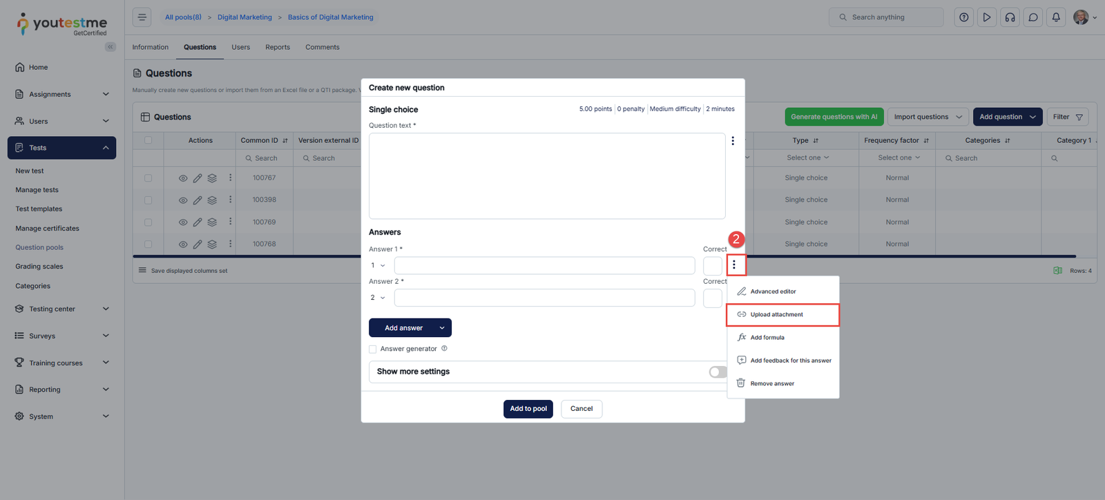 When manually creating a question in the question pool, users have the option to add attachments to both the question and its individual answers. Users can also attach files to the entire question, providing further resources and context for the test-taker. This flexibility allows for a more comprehensive and enriched testing experience. To know how to create a question manually, please read this article.
