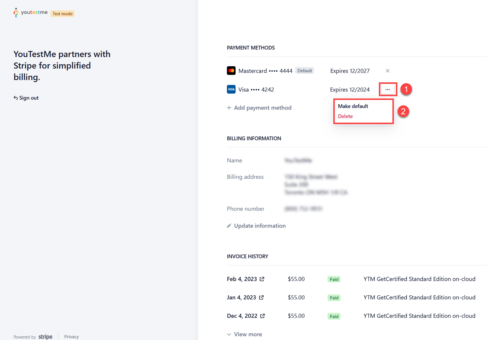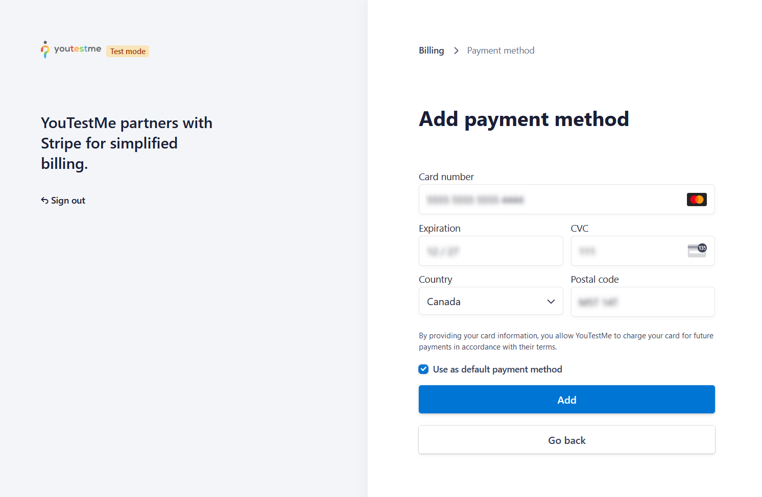 After entering your credit card details and optionally marking it as a default payment method, click the Add button. You will then be redirected back to the Customer Portal.