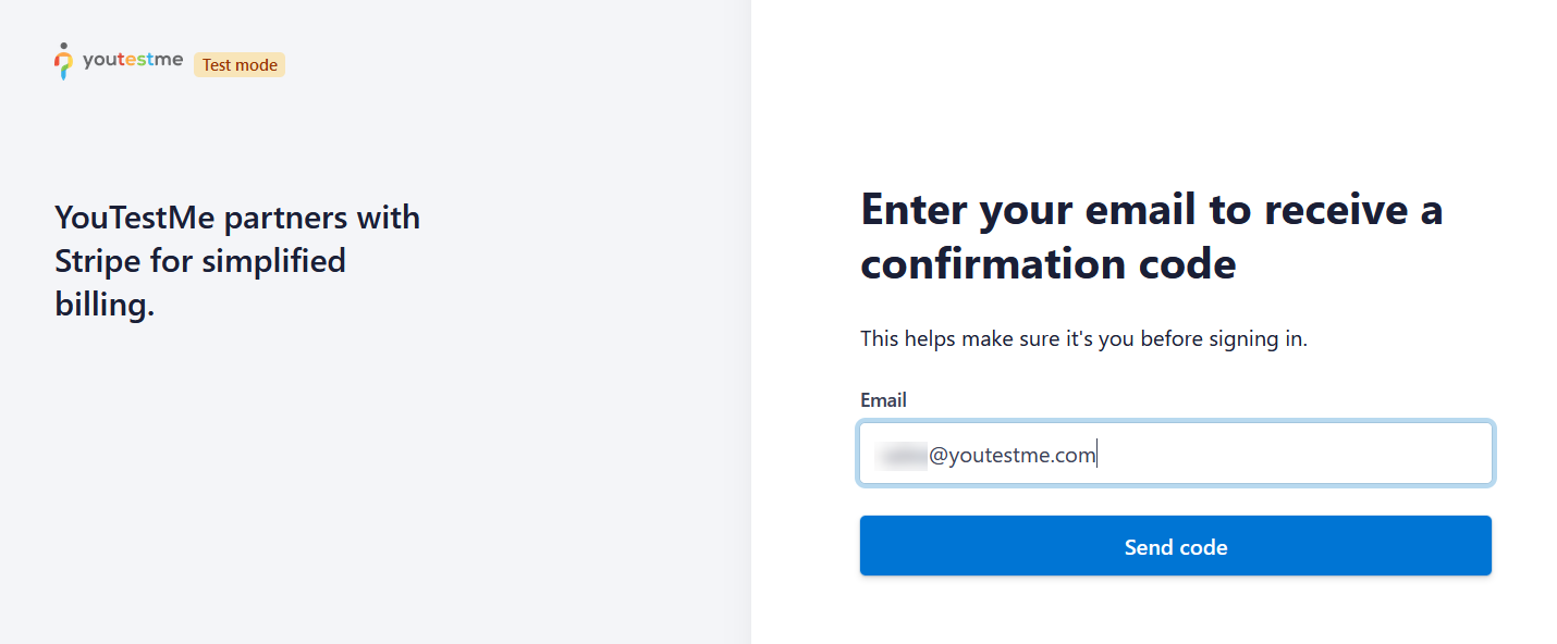 Enter your billing email address. It’s the email address on which you receive your Stripe invoices. Once you enter your email address, click Send code.