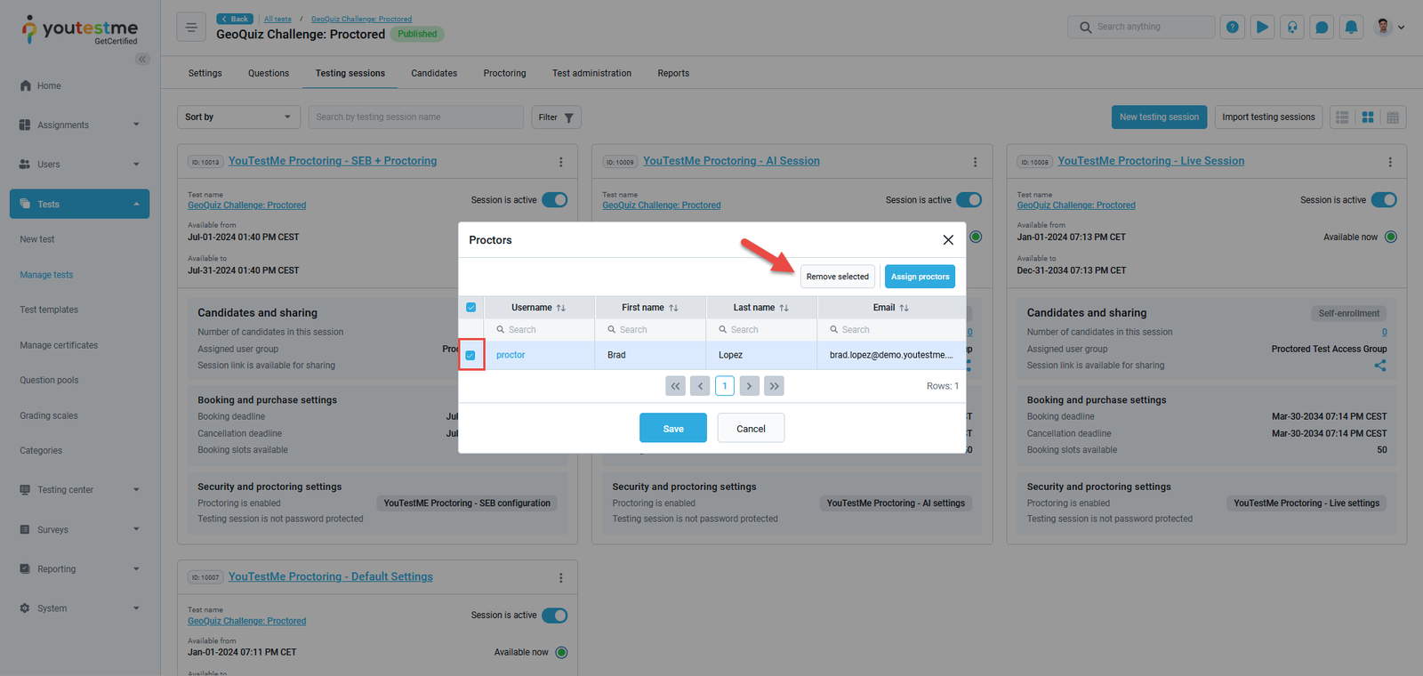 To manage the proctors assigned to monitor a session by adding or removing assigned proctors, follow the same steps described above to access the Manage Proctors dialogue, select the desired proctor, and click on the Remove selected button to remove them from the list.