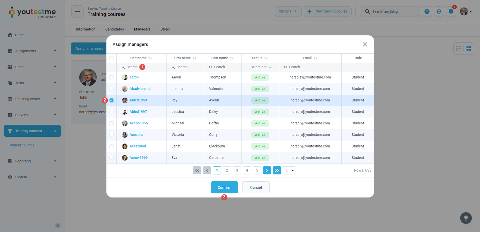 This article explains how to assign a manager to a training course. A training course manager can add steps and training course materials and assign tests, or ad-hoc tests, to the training course. Moreover, they can assign candidates to a course and manage the roles of other application users.