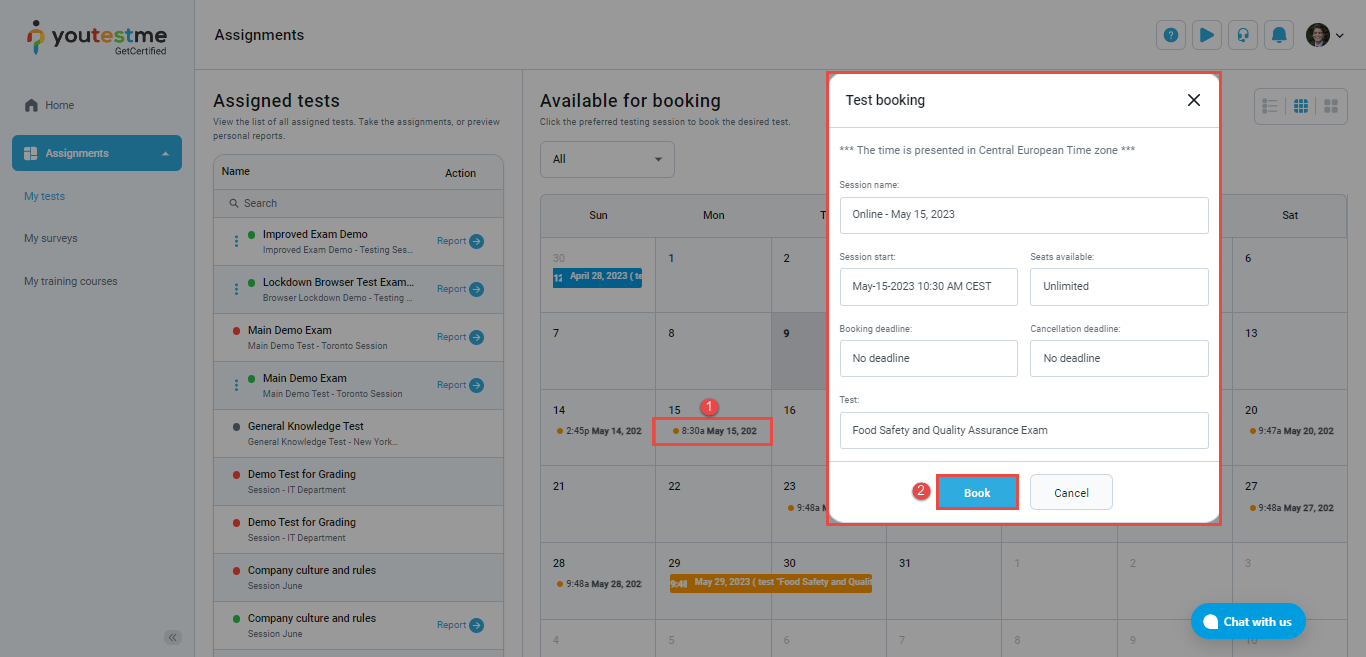 - A list of testing sessions where the candidate can select the most convenient time slot and book a test on the website. This can be done by clicking on the testing session name. A pop-up window will appear displaying all testing session information such as availability time, booking and cancelation deadlines, test name, etc.