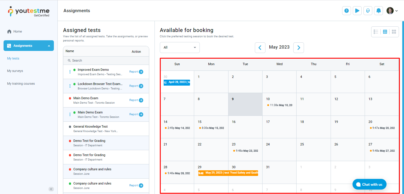 The Calendar view displays expired, available, and upcoming testing sessions.
