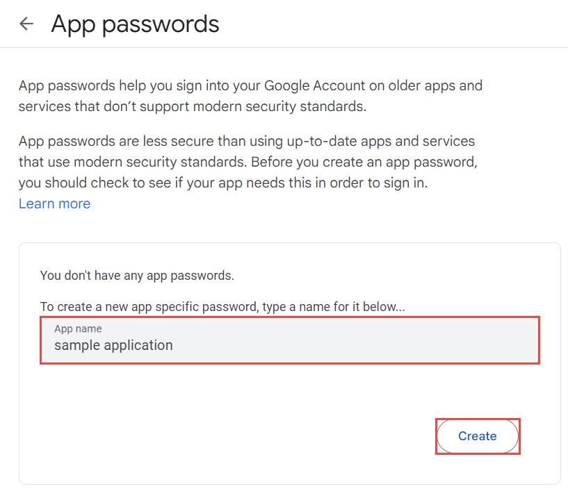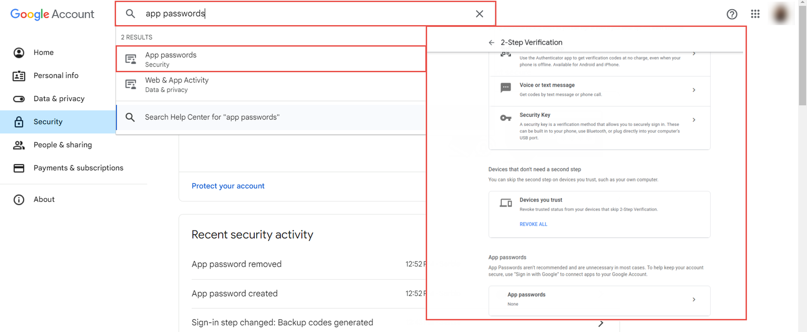 - After 2-Step Verification is configured, there will be an option at the bottom of the page (you could always search for “App passwords” on the https://myaccount.google.com/)