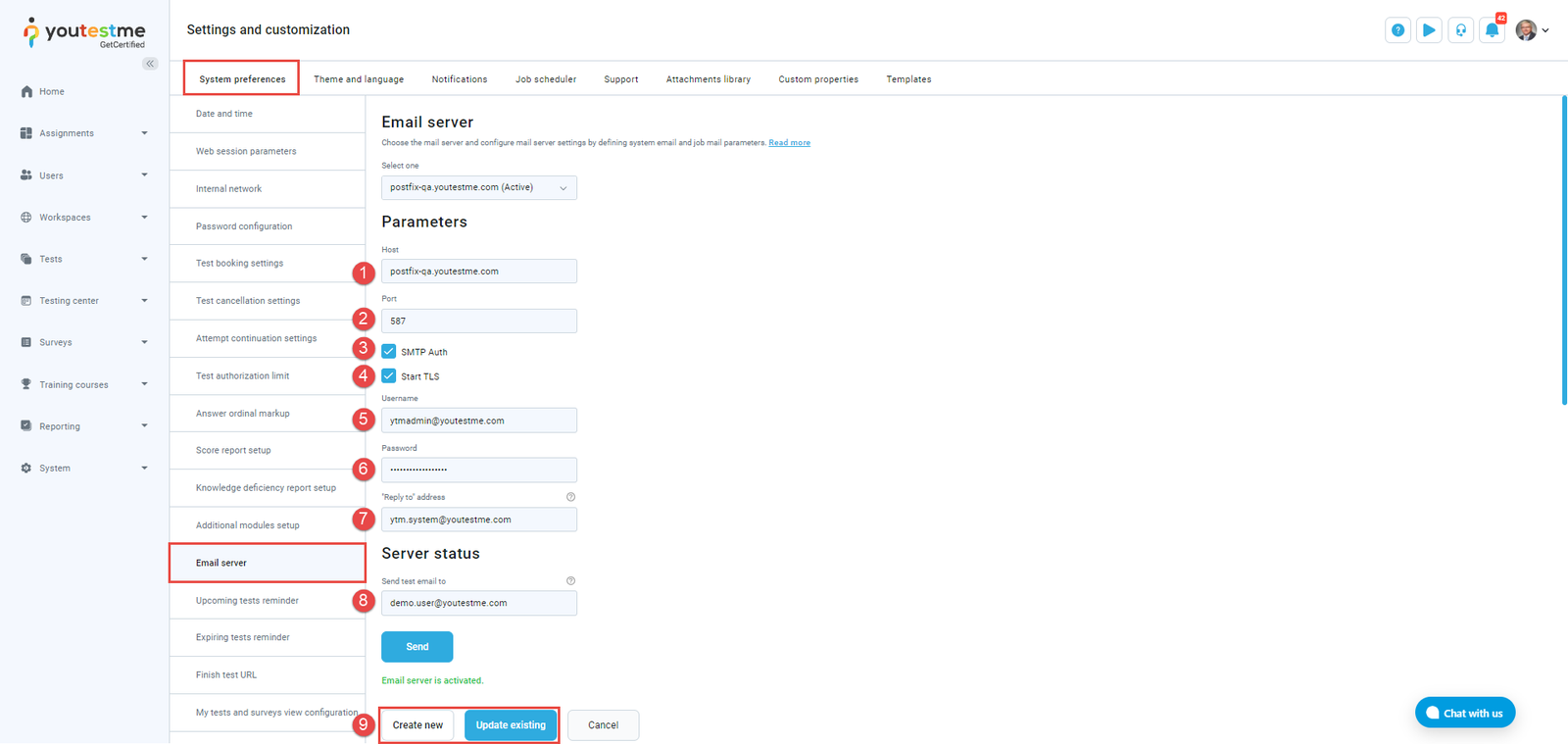 - Click the Create new button to add new email server, or Update existing to reconfigure already added email server.