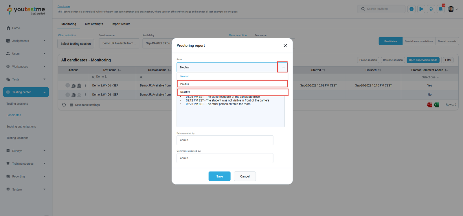 - Status – If a test attempt’s status is Report complete, that indicates that there were no suspicious behaviors observed during the test, and the proctor has rated the test attempt as Positive. Therefore, you need to set the test attempt status to Report incomplete.