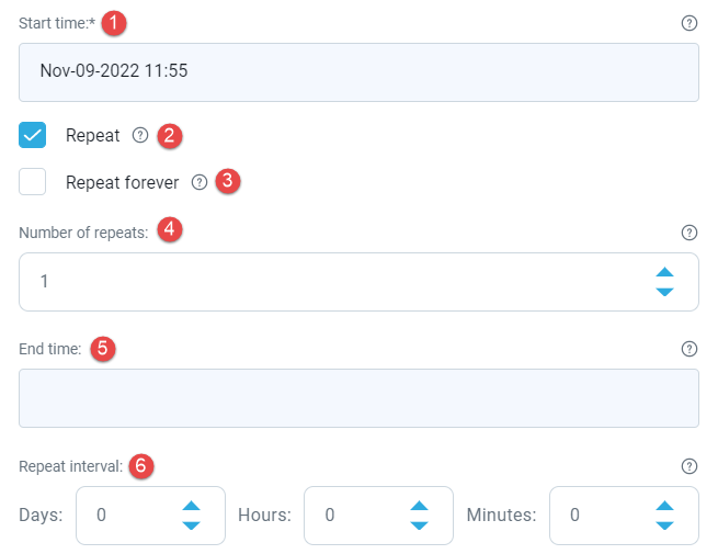 - Schedule settings – Parameters of the schedule, start time, end time, repeat interval, and the number of repeats.