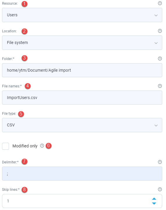 - Check the Modified only option to import files created or modified after the previous job execution. Leave it unchecked to import all files from the folder satisfying the File names regex expression.