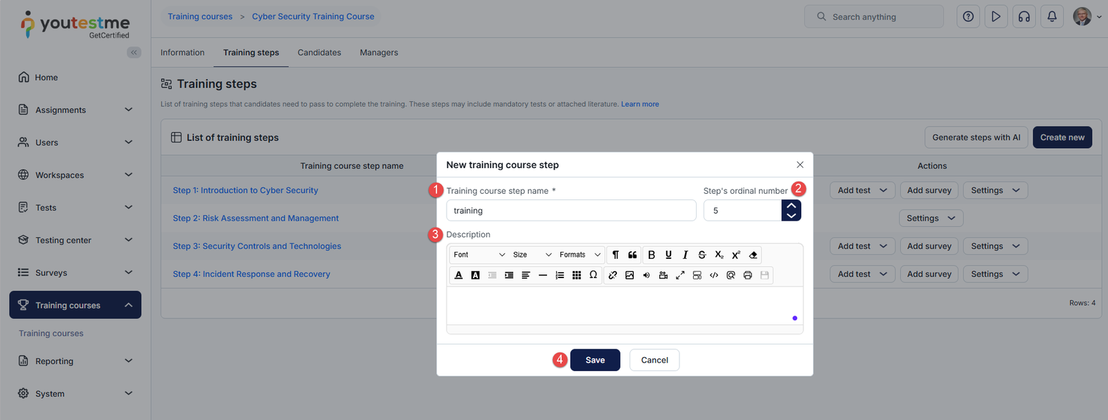 To add the training course steps, navigate to the Training Steps tab. In this tab, you have the option to manually add a training step using the Create New button or generate steps using artificial intelligence.