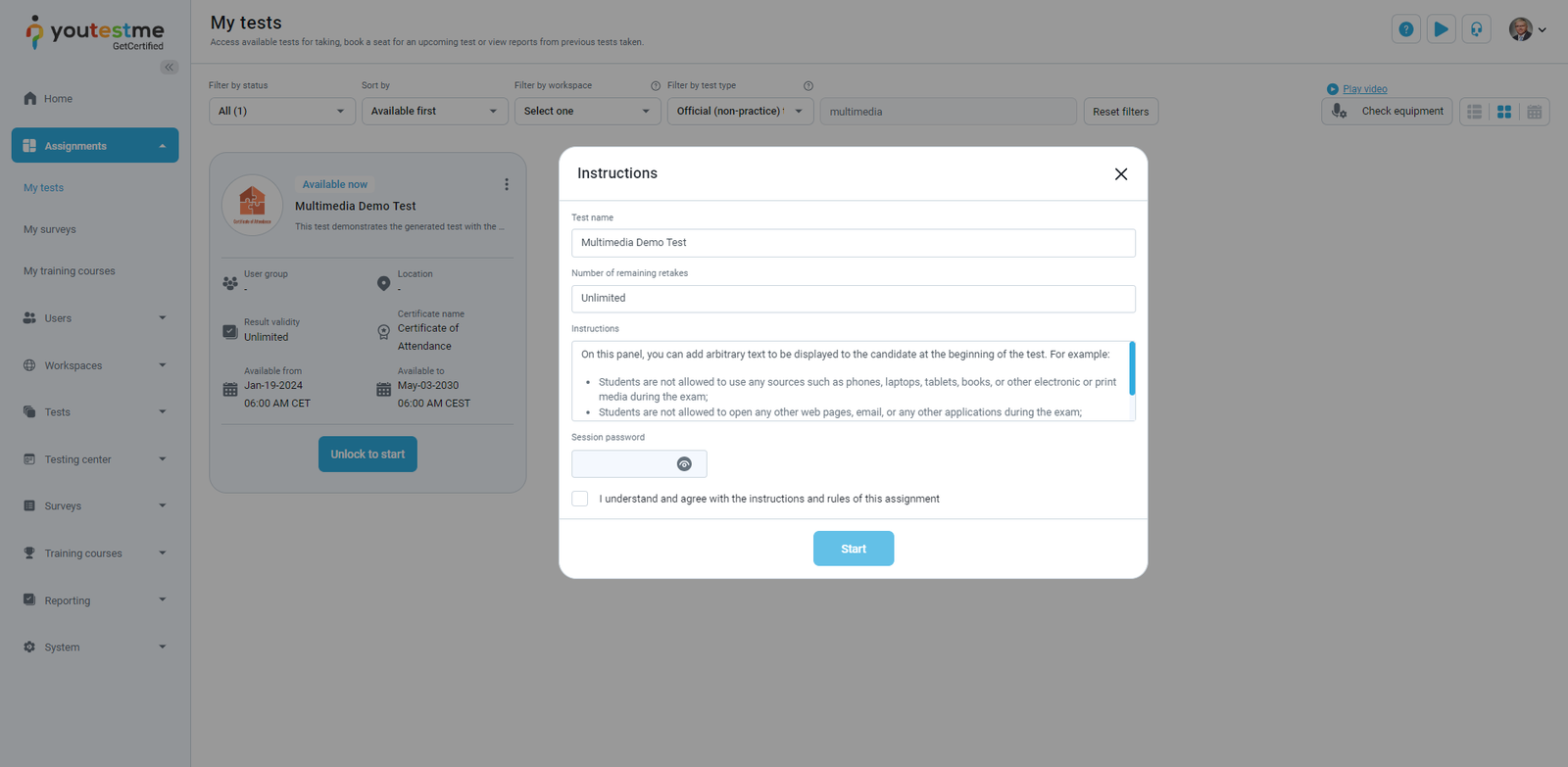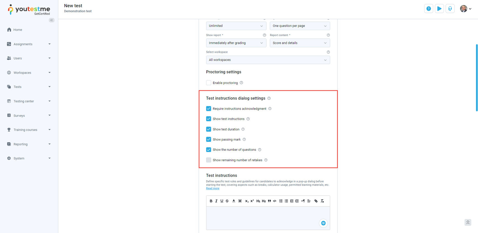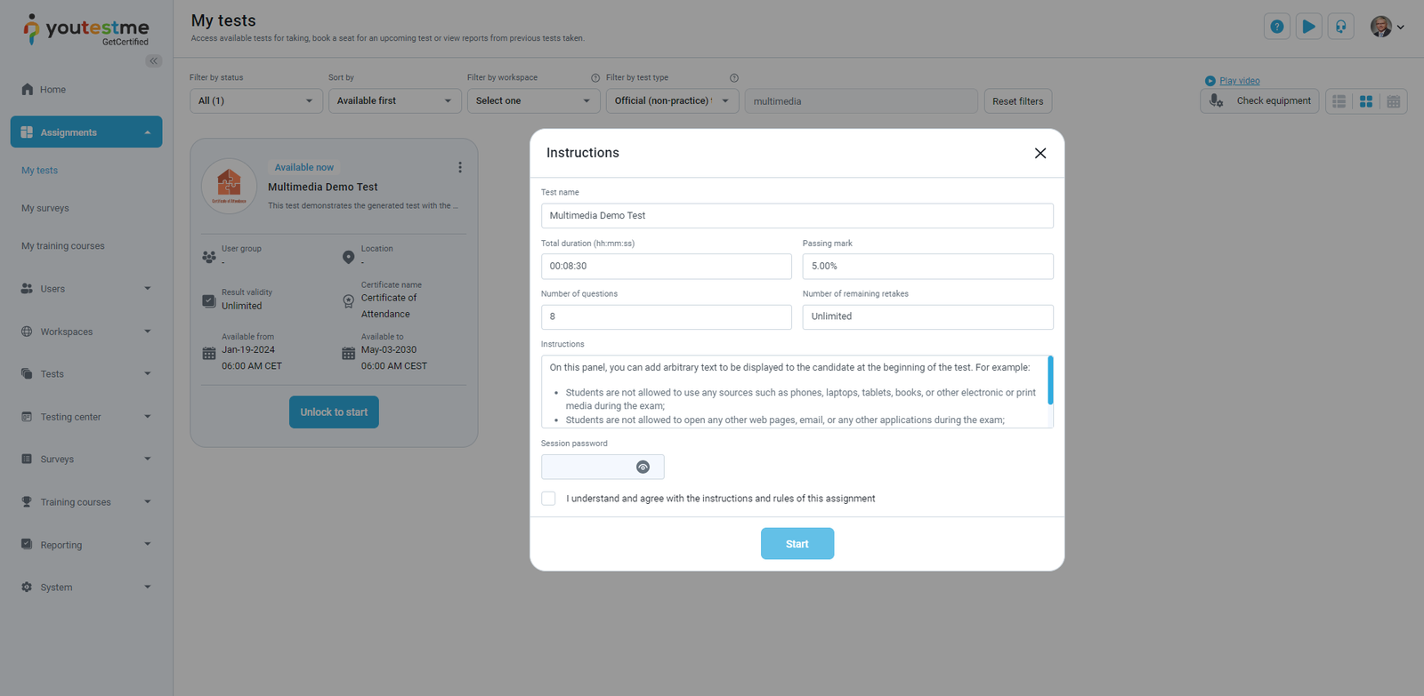 - Displaying the previously defined test instructions that candidates can read before the test.