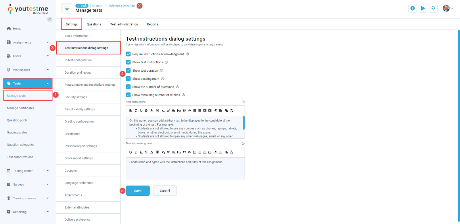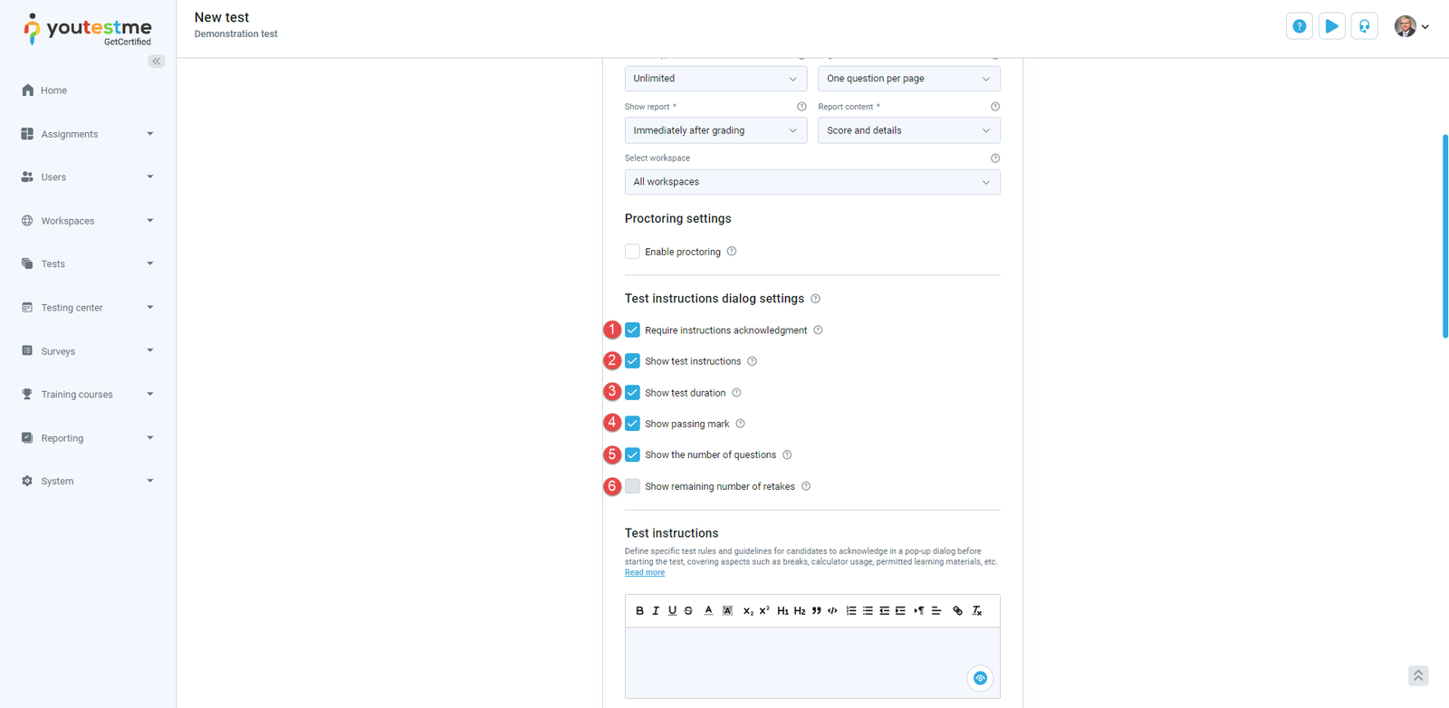 - Requiring candidates to acknowledge test instructions before the test starts.