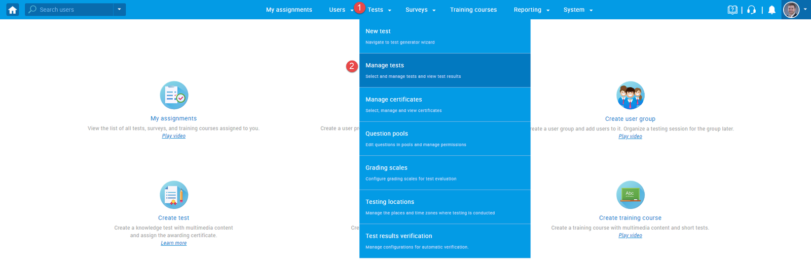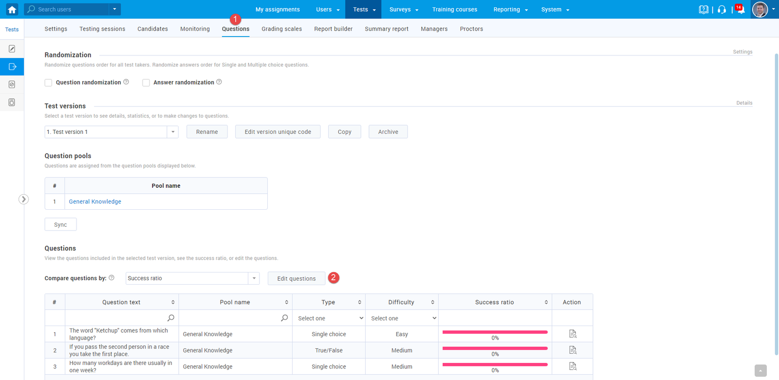 - Hover over the “Tests” section in the main menu, then select “Question pools“.