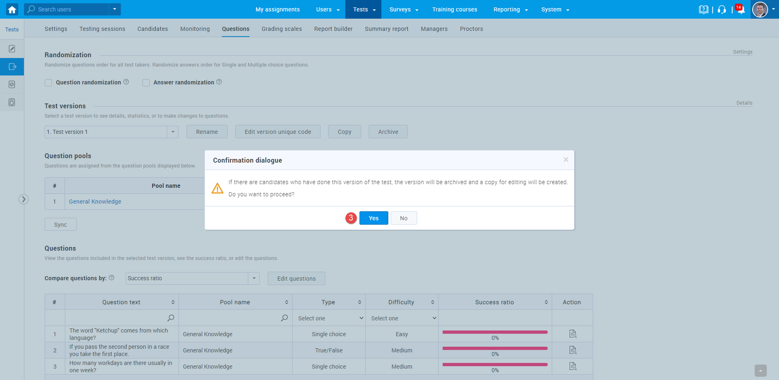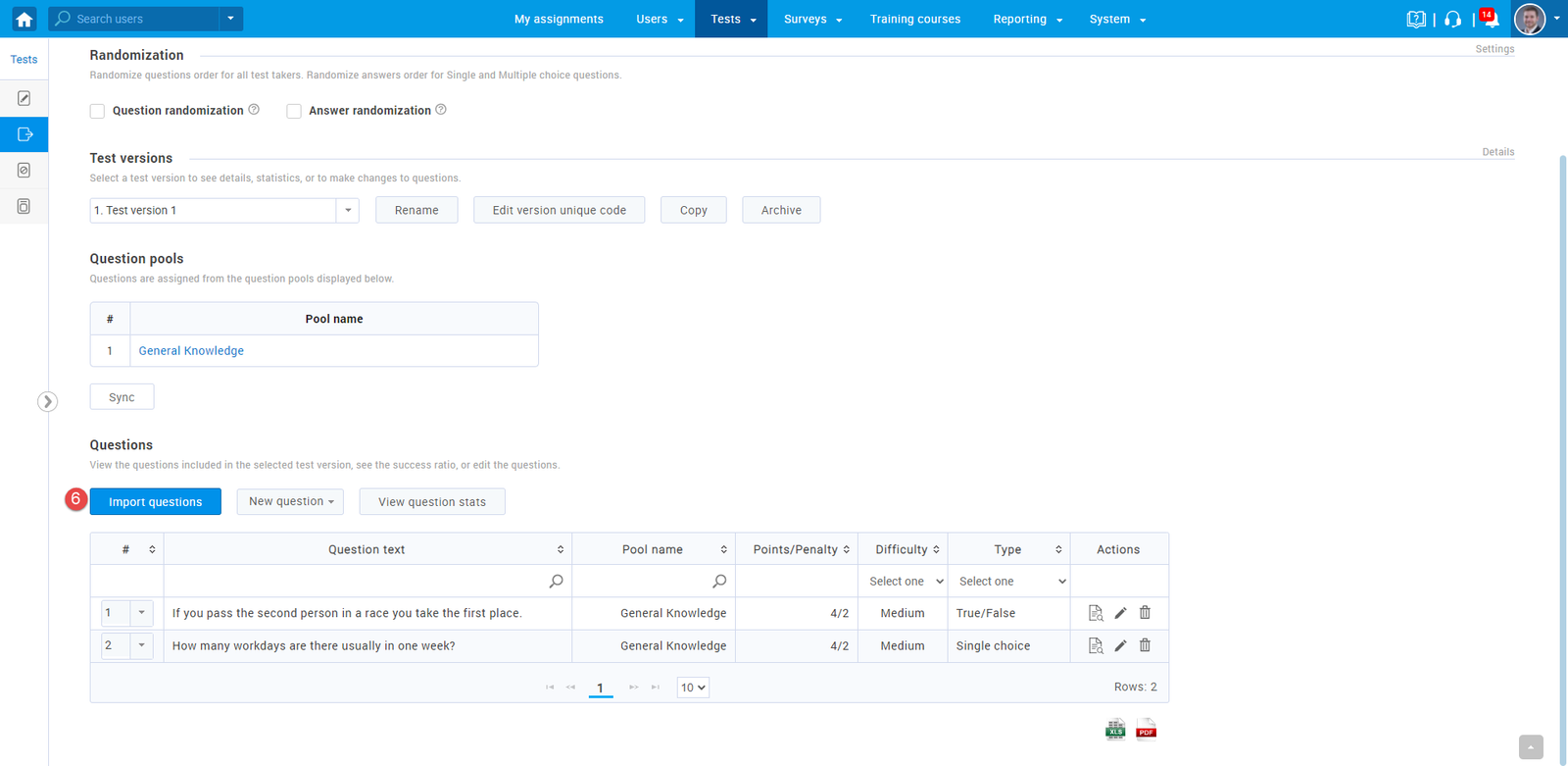 Note: In this way, it is possible to add new versions of questions from the pool, but also to add new questions from previously assigned or new pools.