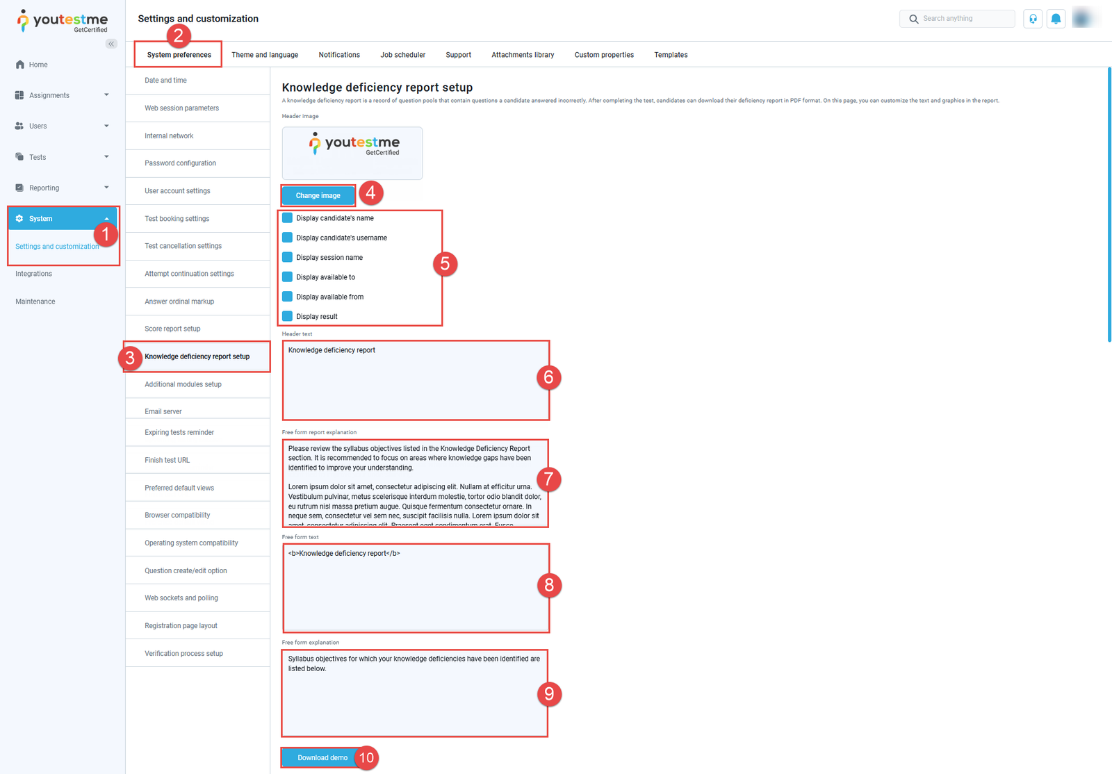 Enabling the download of the “Knowledge deficiency report” in the test