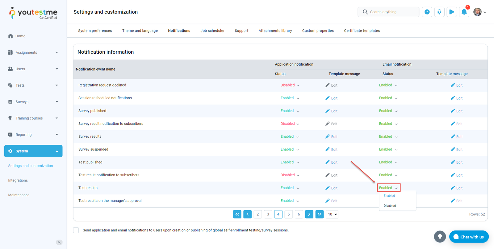 - Find the Test results notification and click on the Edit option in the e-mail notification column.
