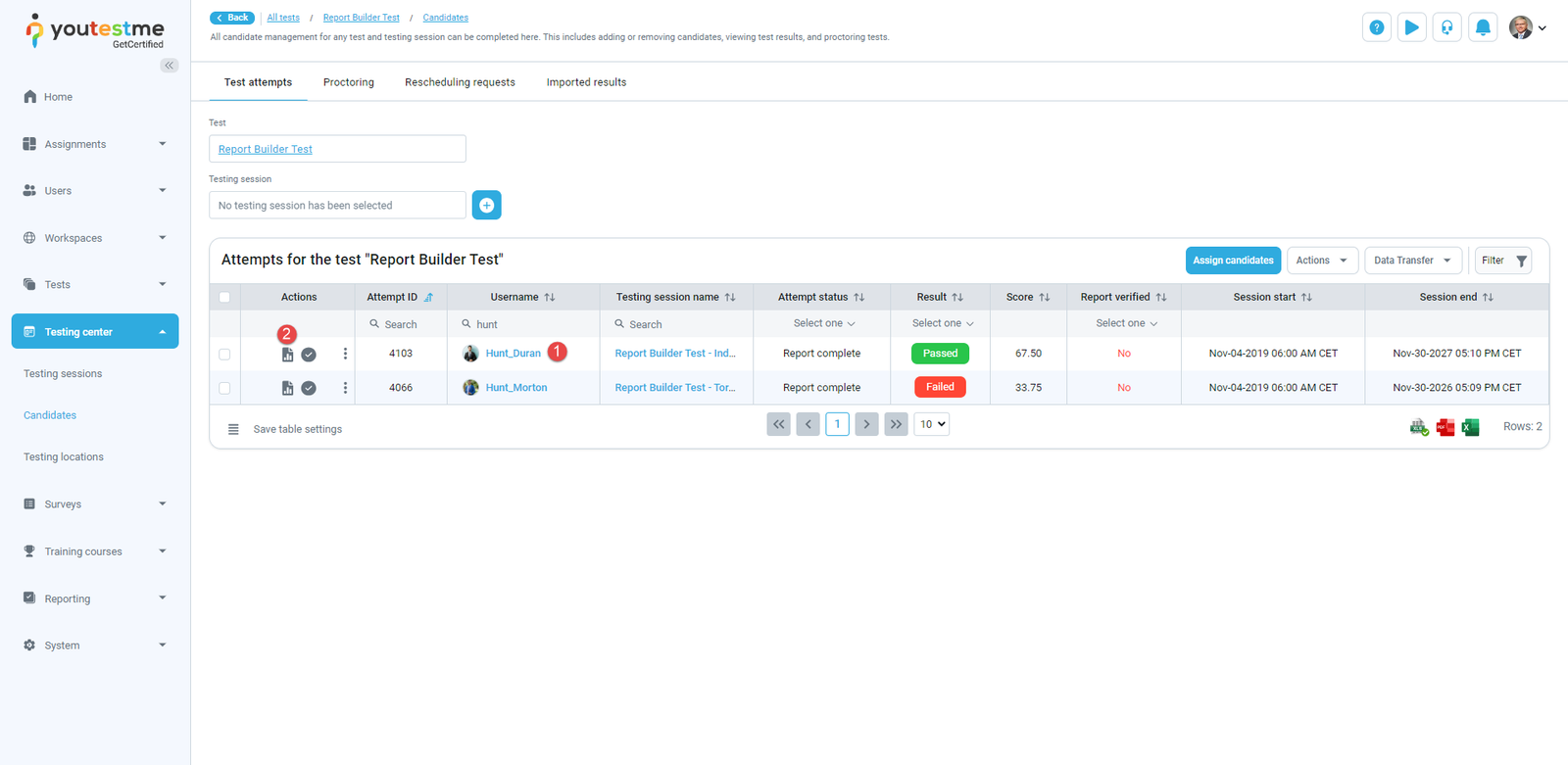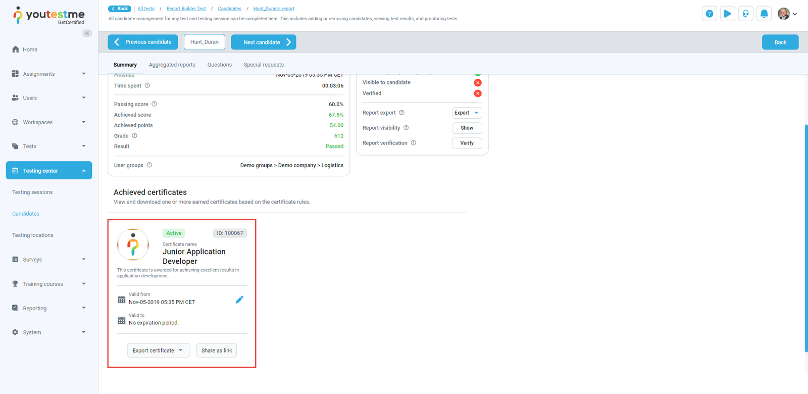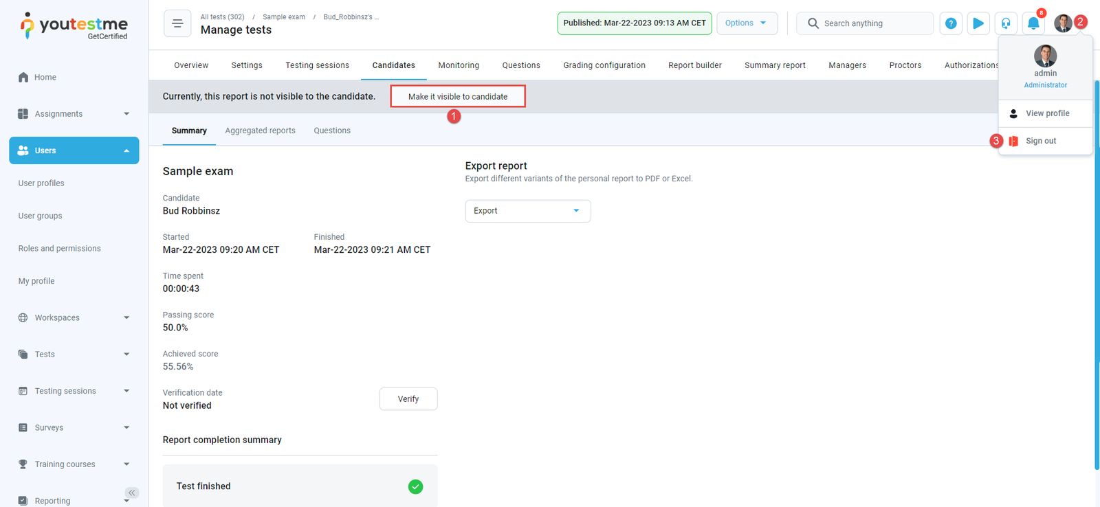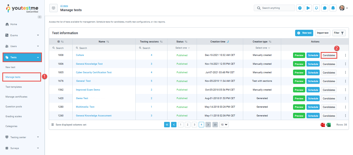 - Once you finish the test as a student, log in as an administrator, and navigate to the Testing center/Candidates tab.