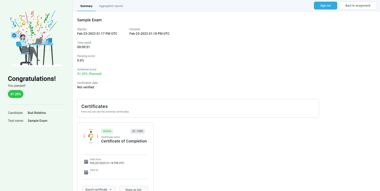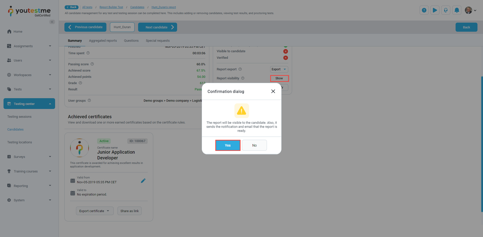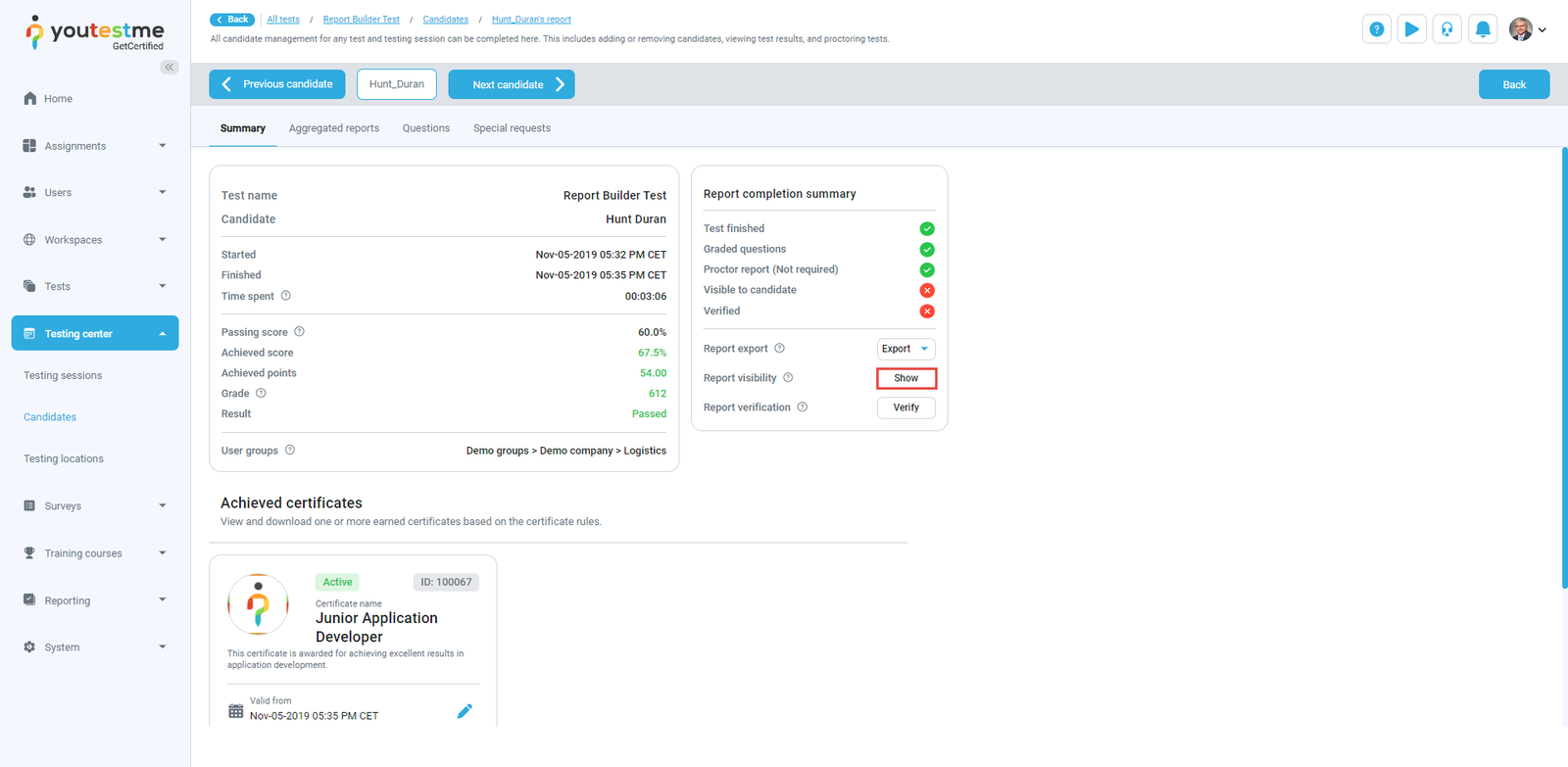 - Once you finish the test as a student, log in as an administrator, and navigate to the Testing center/Candidates tab.