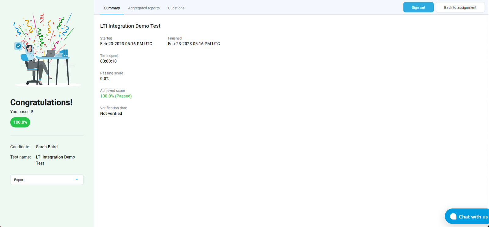 Once the test is completed, the candidate may be redirected to the personal report (depending on the test settings), and once checked, the candidate can sign out by clicking the button in the top right corner.