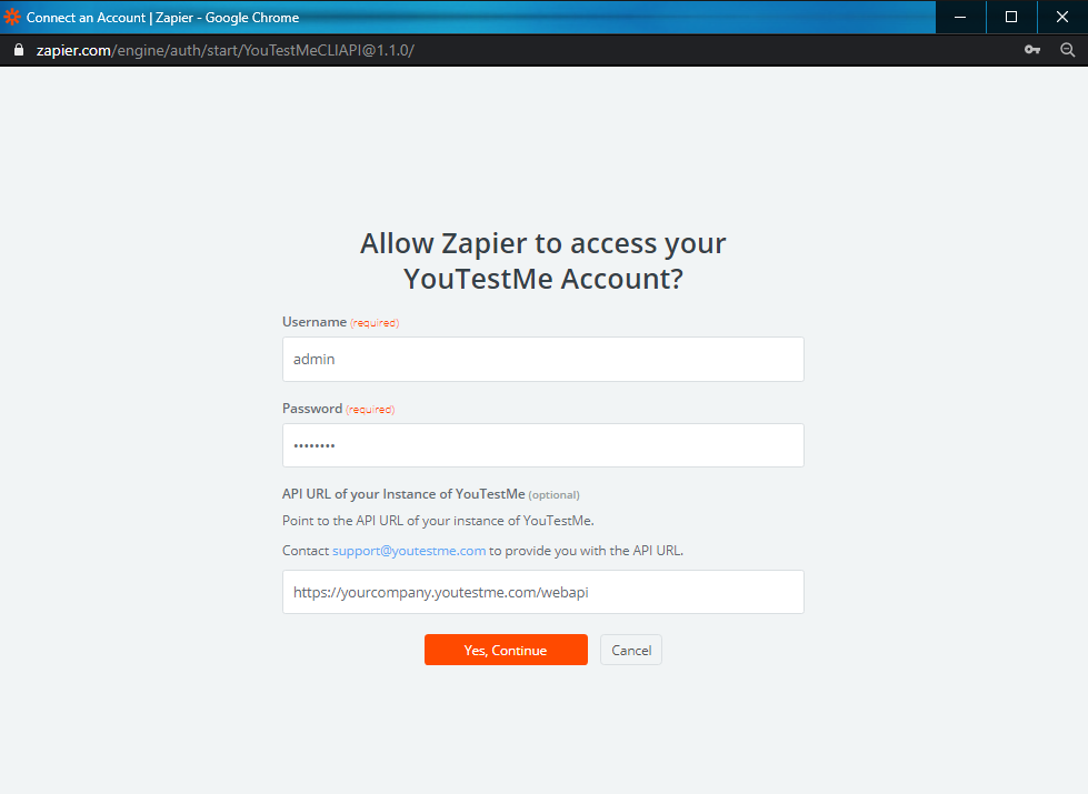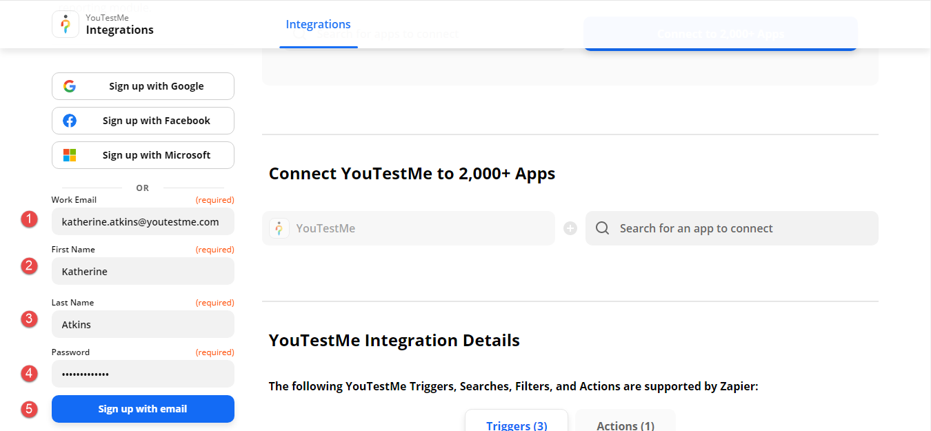 Navigate the YouTestMe Zapier integration link. You can sign in to Zapier using: