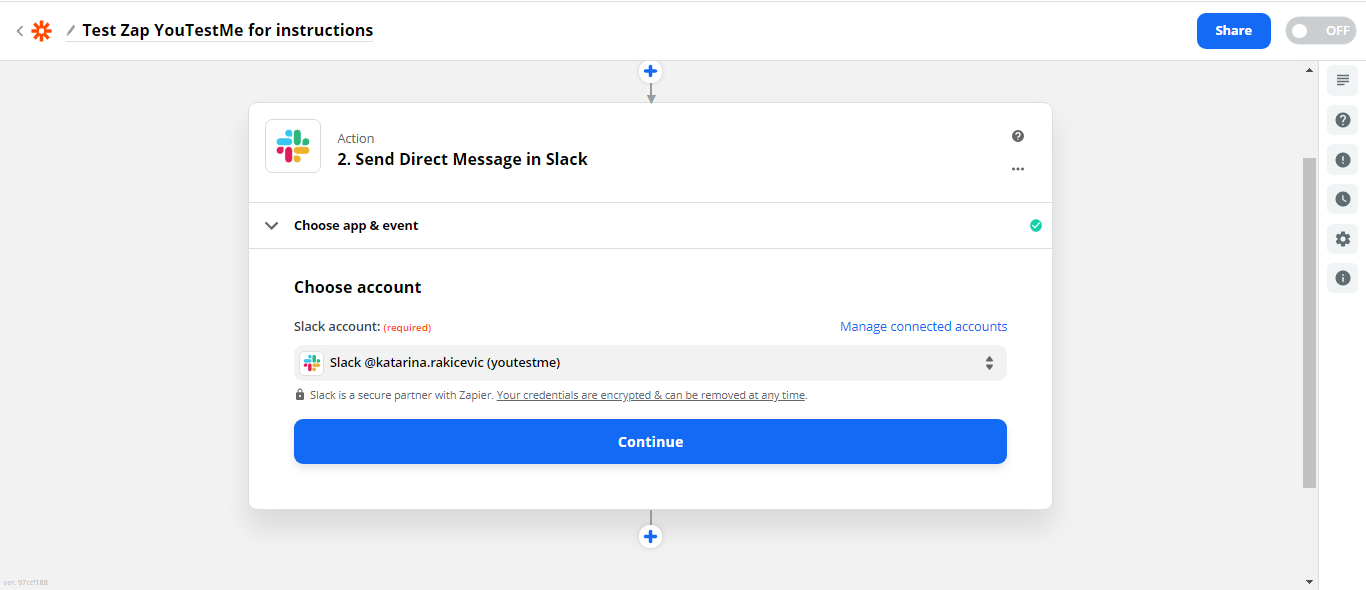 Sign in to Slack, and allow Zapier to access the Slack workspace. Then choose the account to send the direct message and click the Continue button.