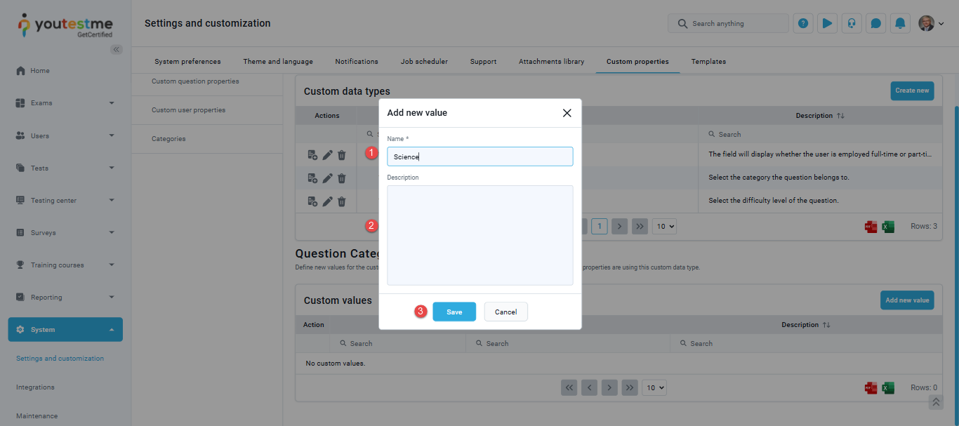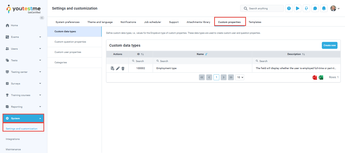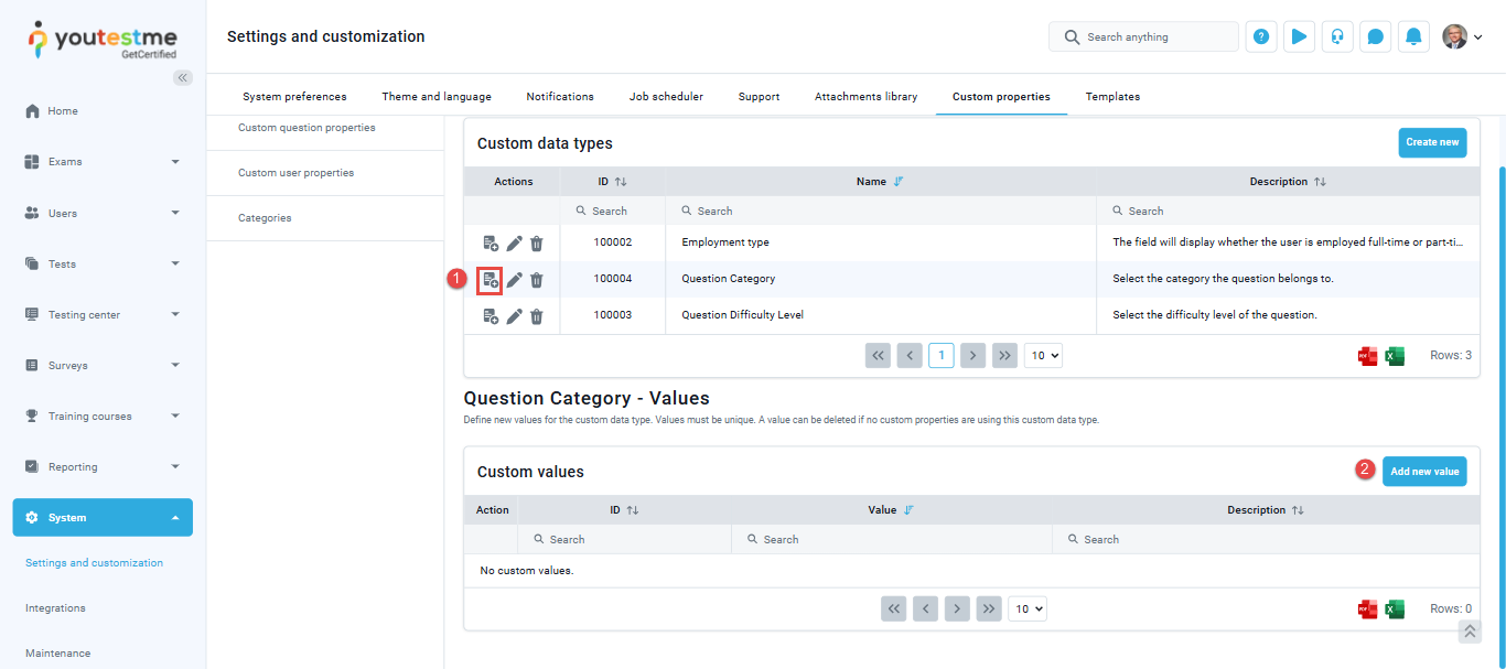 To access the Custom properties, select the System in the left-side menu and select Settings and Customization from the drop-down menu. Then select the Custom Properties tab.