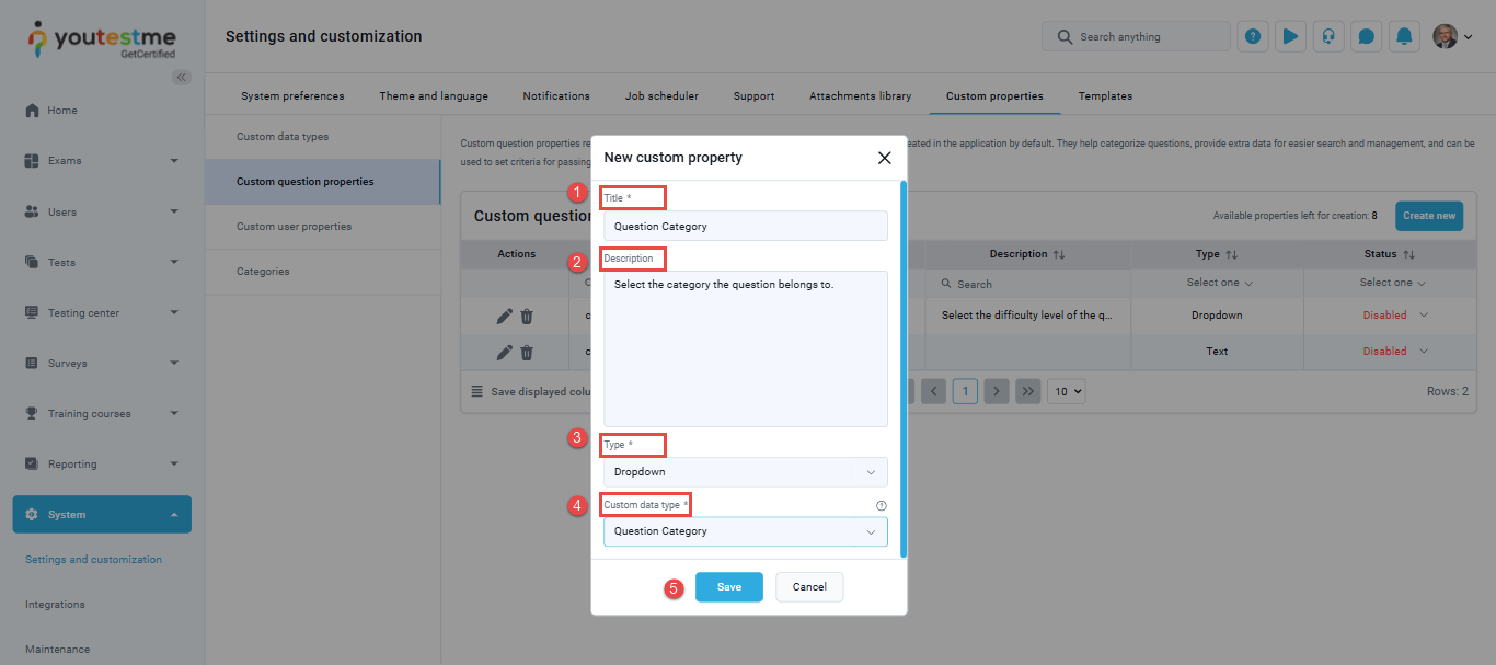 When manually creating a question in the Question Pool, the Custom Question Properties fields are displayed under the Additional Settings section. This feature allows users to assign the desired properties to the question efficiently.