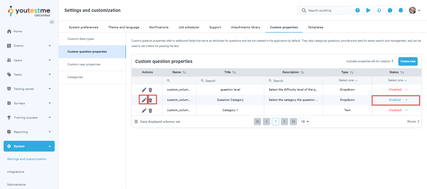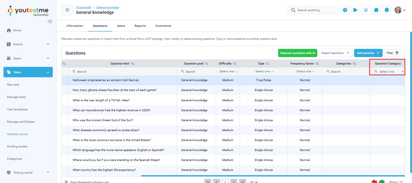 The entered question property will appear as a new column in the questions table. This column will include filters, enabling users to sort and filter questions based on the custom properties created.