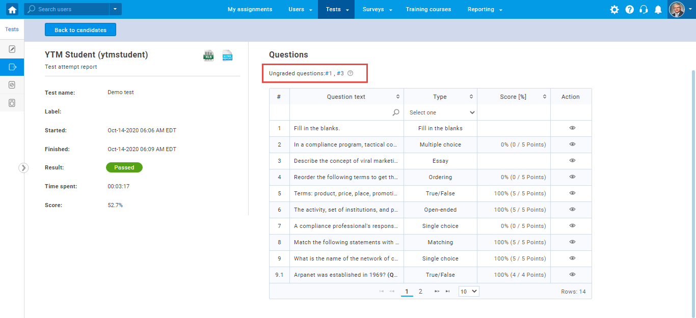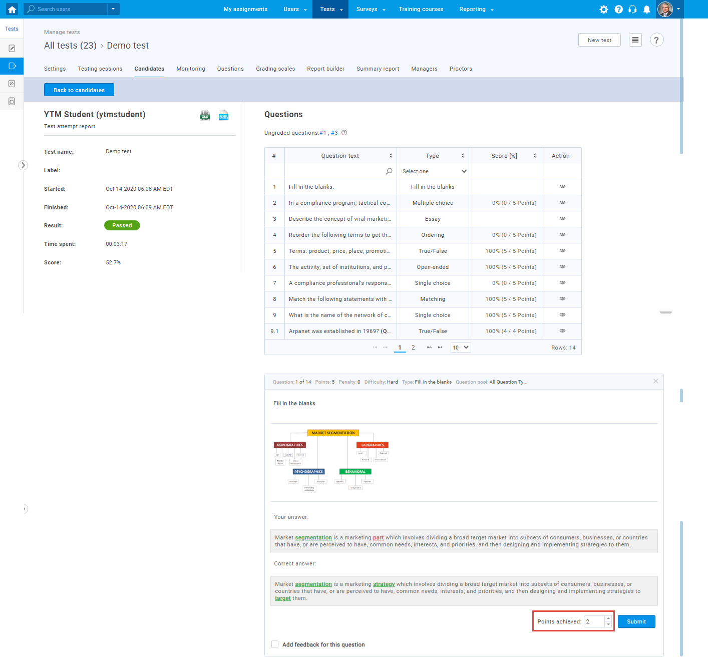 When a candidate completes the test, a test report will become available for a test manager’s grading and review.