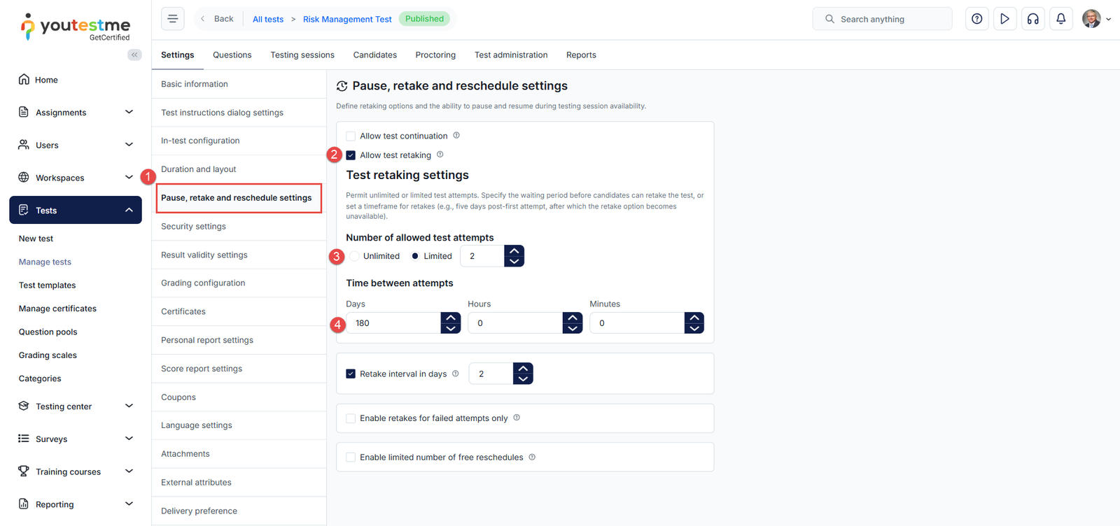 - If you choose limited, note that the specified number includes the initial attempt. For example, setting the limit to 3 allows the candidate to retake the test twice after the first attempt.