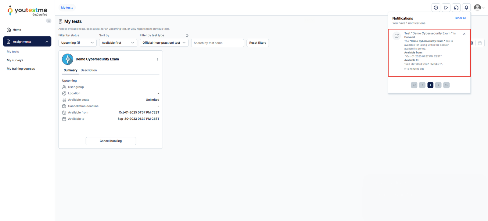 Once booked, the exam status becomes Upcoming, and you can cancel the booking using the Cancel booking button.