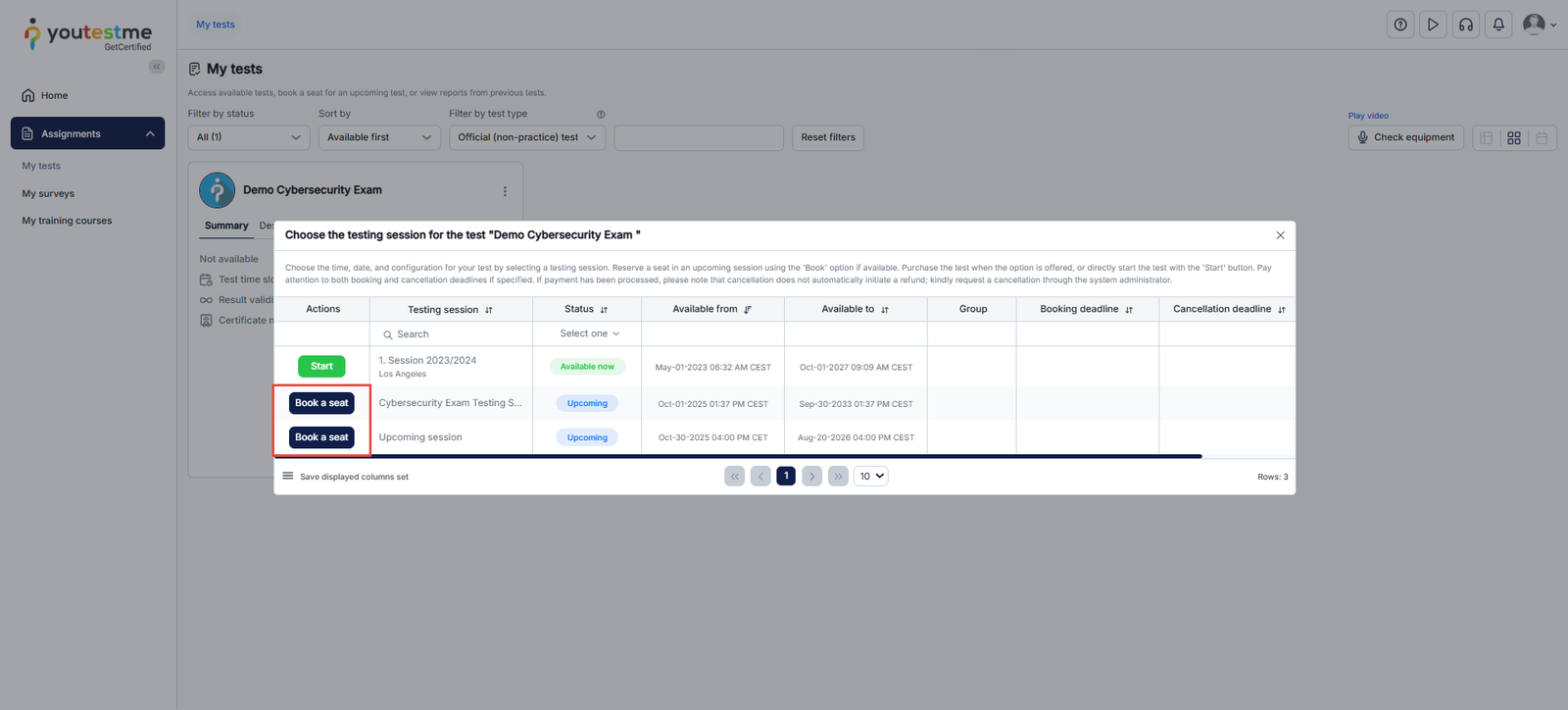 Use the Choose the sessions button if the test has multiple sessions. In the available sessions list, click Book to reserve the desired session.