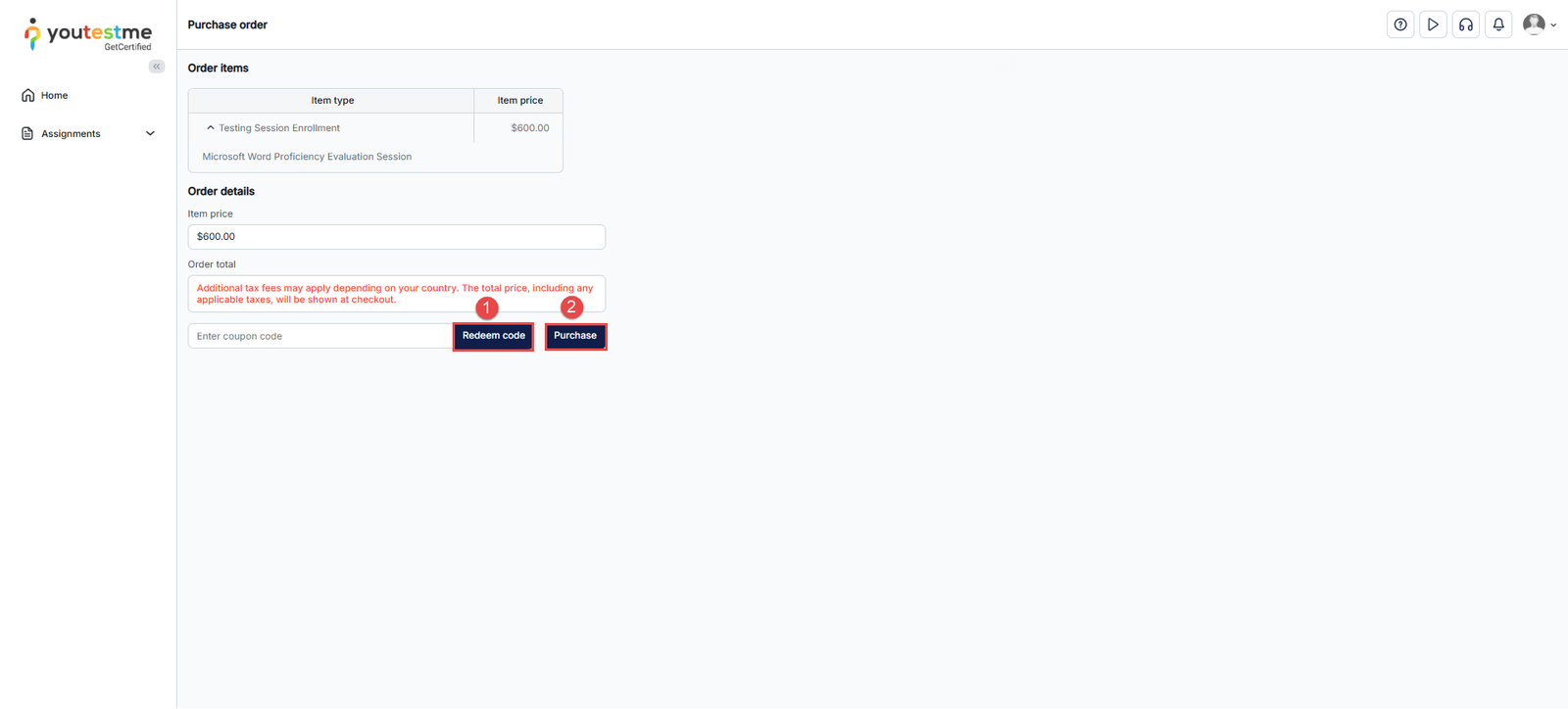 - Enter coupon code – insert a free coupon(if provided) to take a test without paying any fees. For more information on how to use test coupons, check this article.
