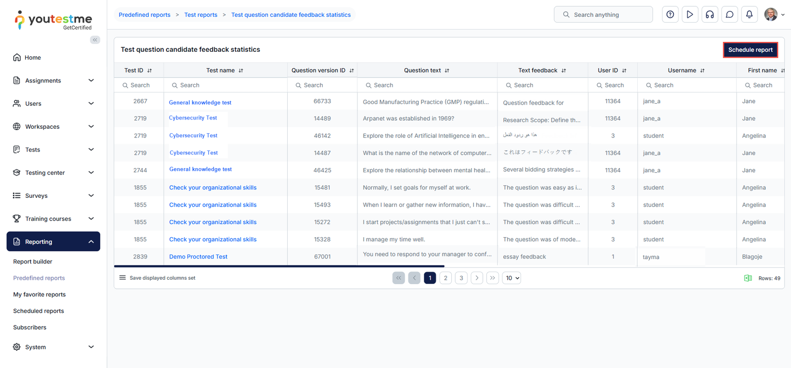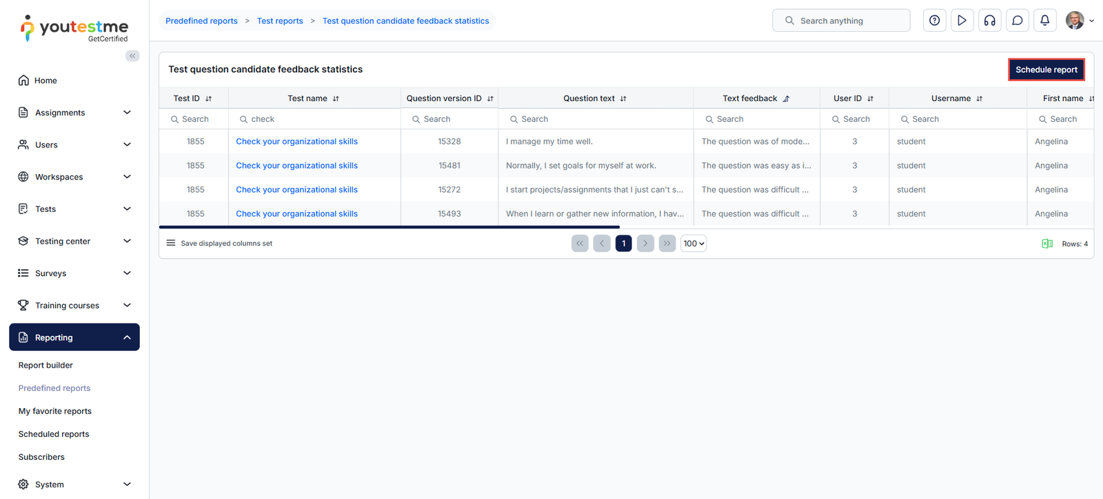 This report consolidates all candidate feedback on test questions across multiple tests. Like the individual test report, it can also be scheduled for automatic delivery by selecting Schedule Report.