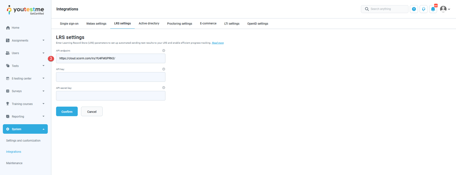 The LRS settings assure the manager of a test to send each candidate’s test results into the LRS system and track each candidate’s success.