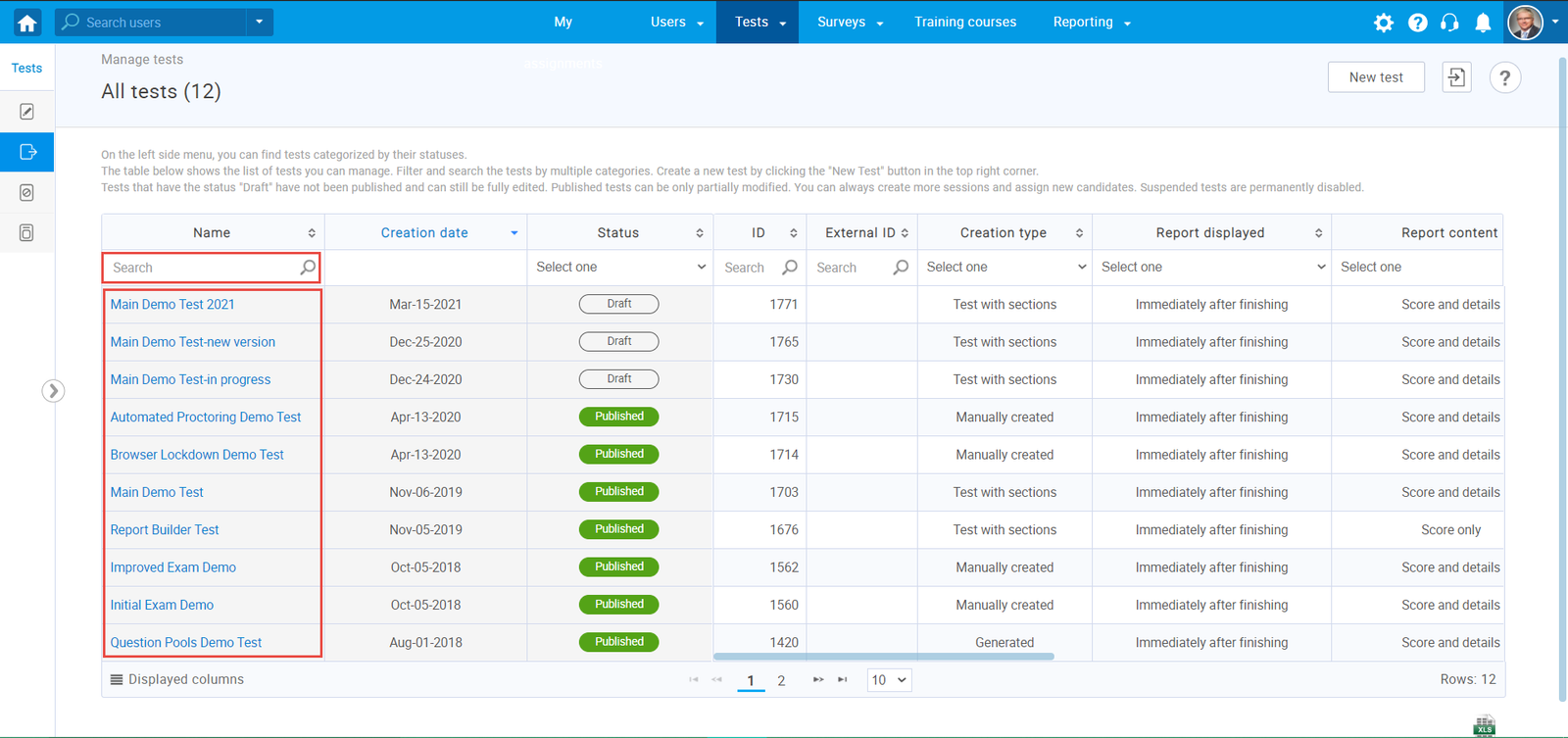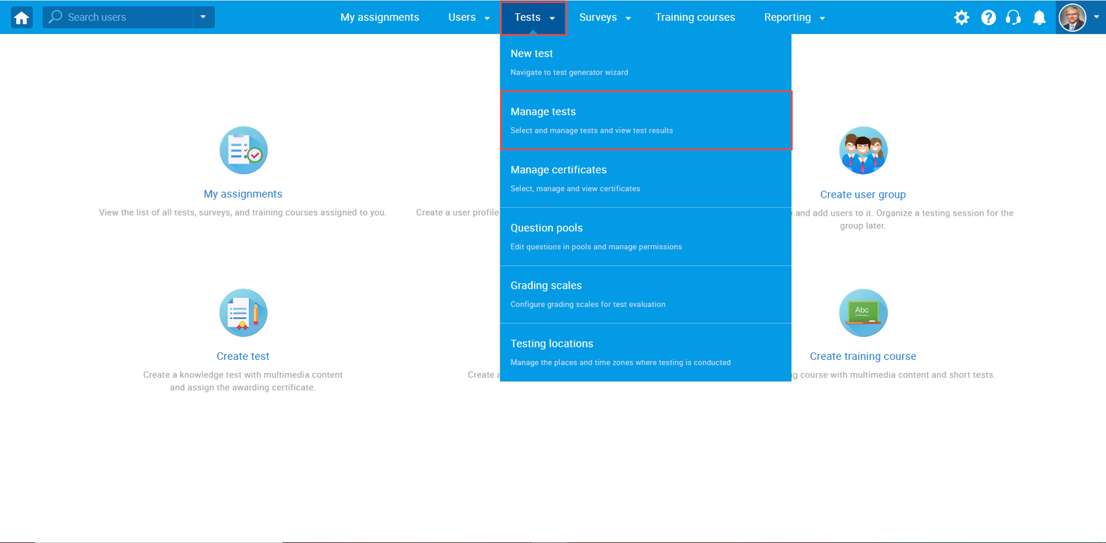 Hover over the “Tests” tab in the main menu, then choose “Manage tests“.