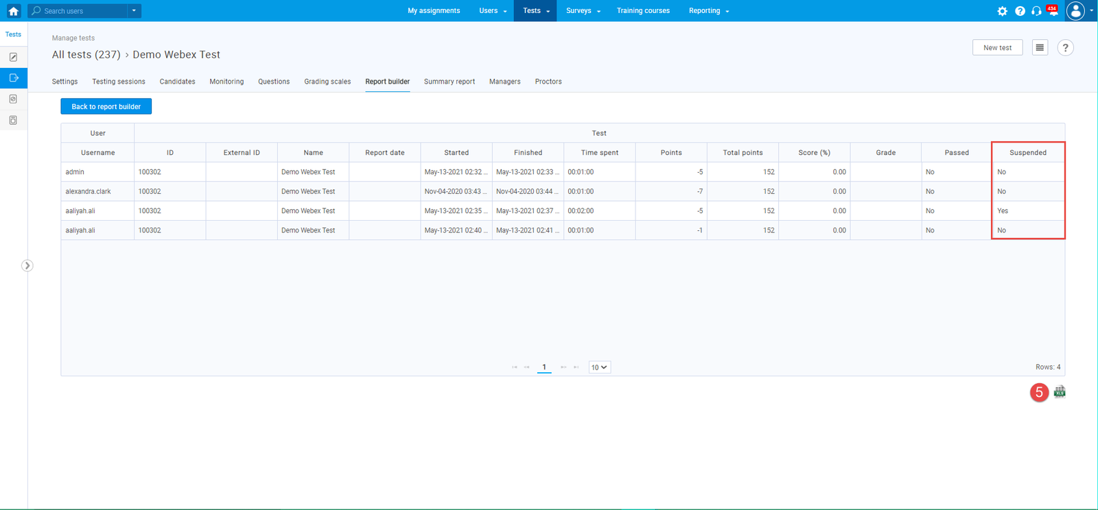 Now you can see the table with all attempts and in the column named “Suspended,” you can see if the attempts are suspended or not and export data from this table.