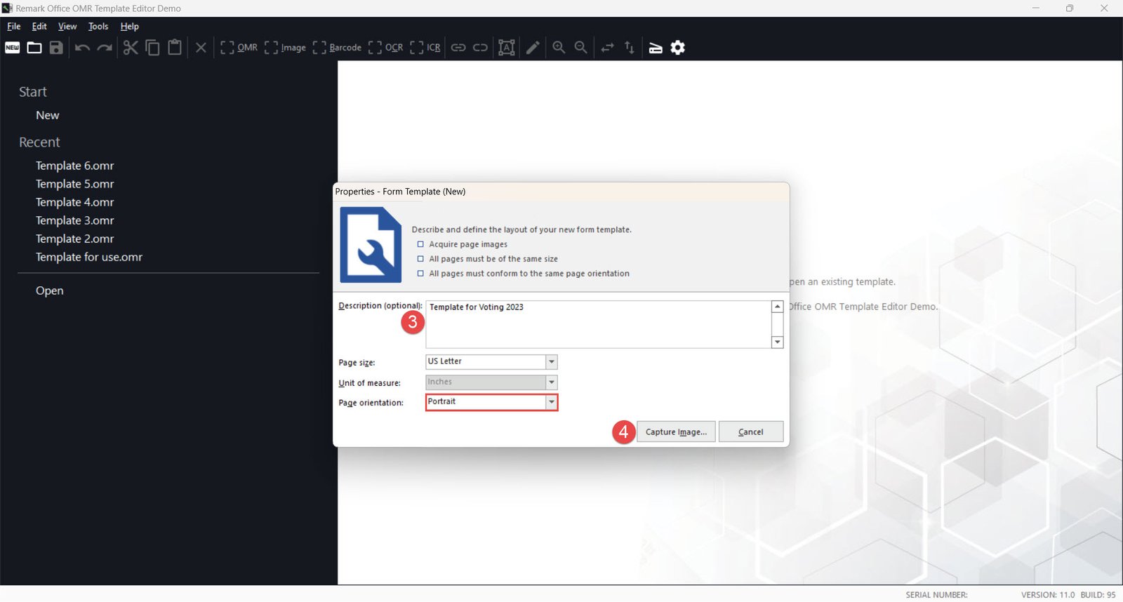 You can use previously exported test data in PDF format to create a template, which you’ll later use for scanning and inputting the results of a vote. To get started, open Remark Office OMR: